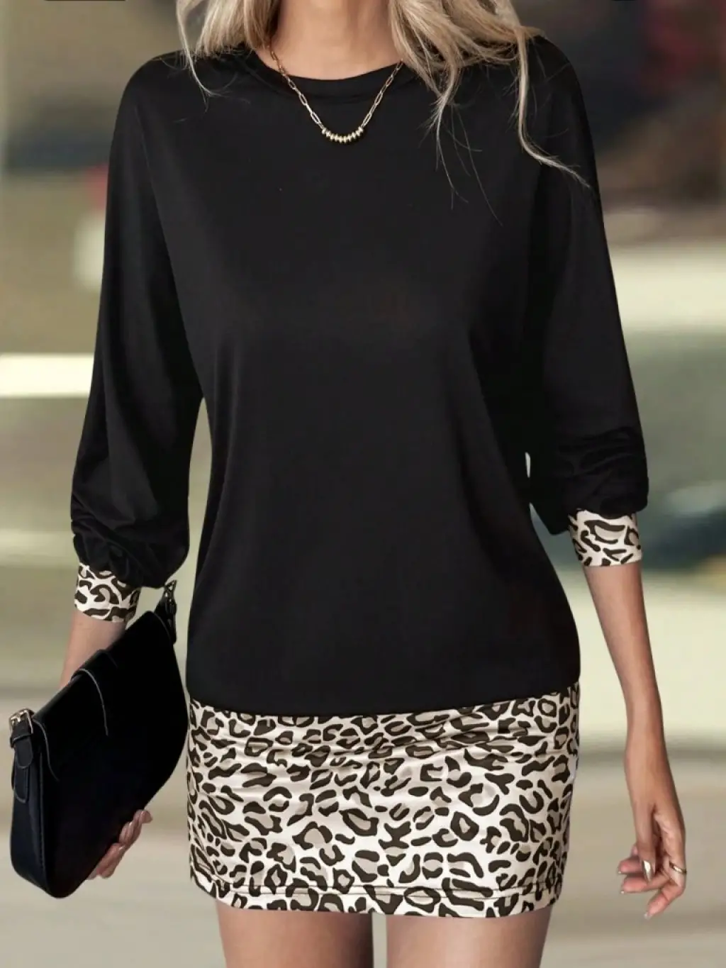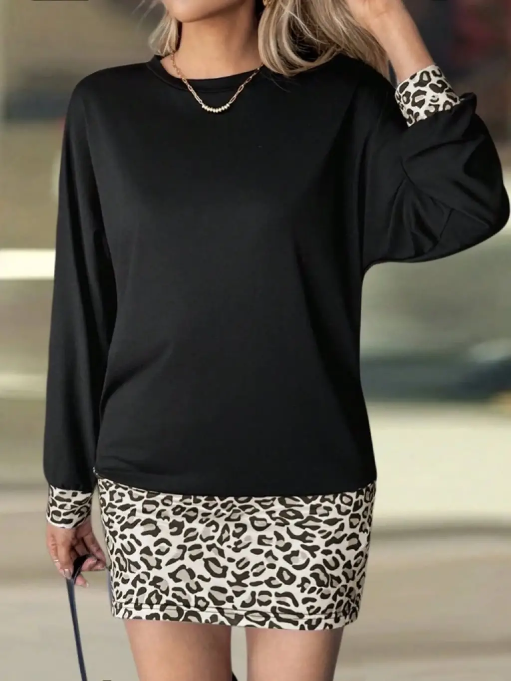 Kadın Uzun Kollu Bisiklet Yaka üst Viskon Iki Iplik Alt Leopar Desenli Mini Elbise