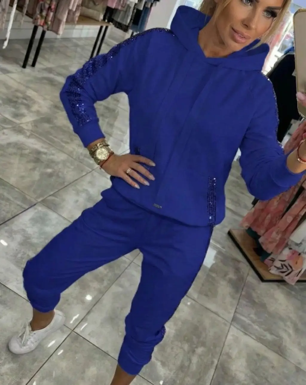 Kadın Uzun Kollu Kapşonlu Pulpayet Detay Viskon Iki Iplik Bluz Ve Pantolon Ikili Takım