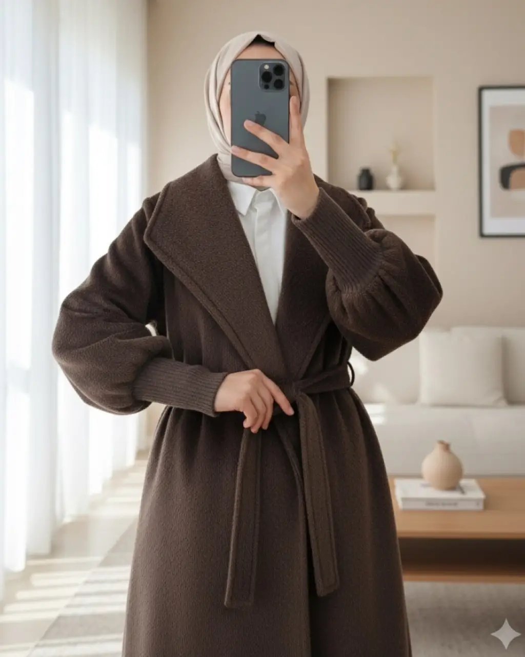Kolu Ribanalı Şal Yaka Astarlı Kaşe Kaban -K. Kahve