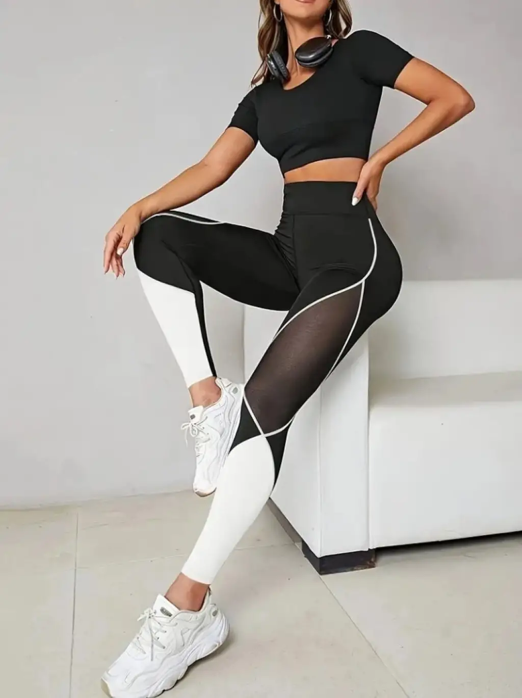 Kadın Yüksek Bel Yanlardan Tül Detaylı çift Renkli Spor Dalgıç Tayt