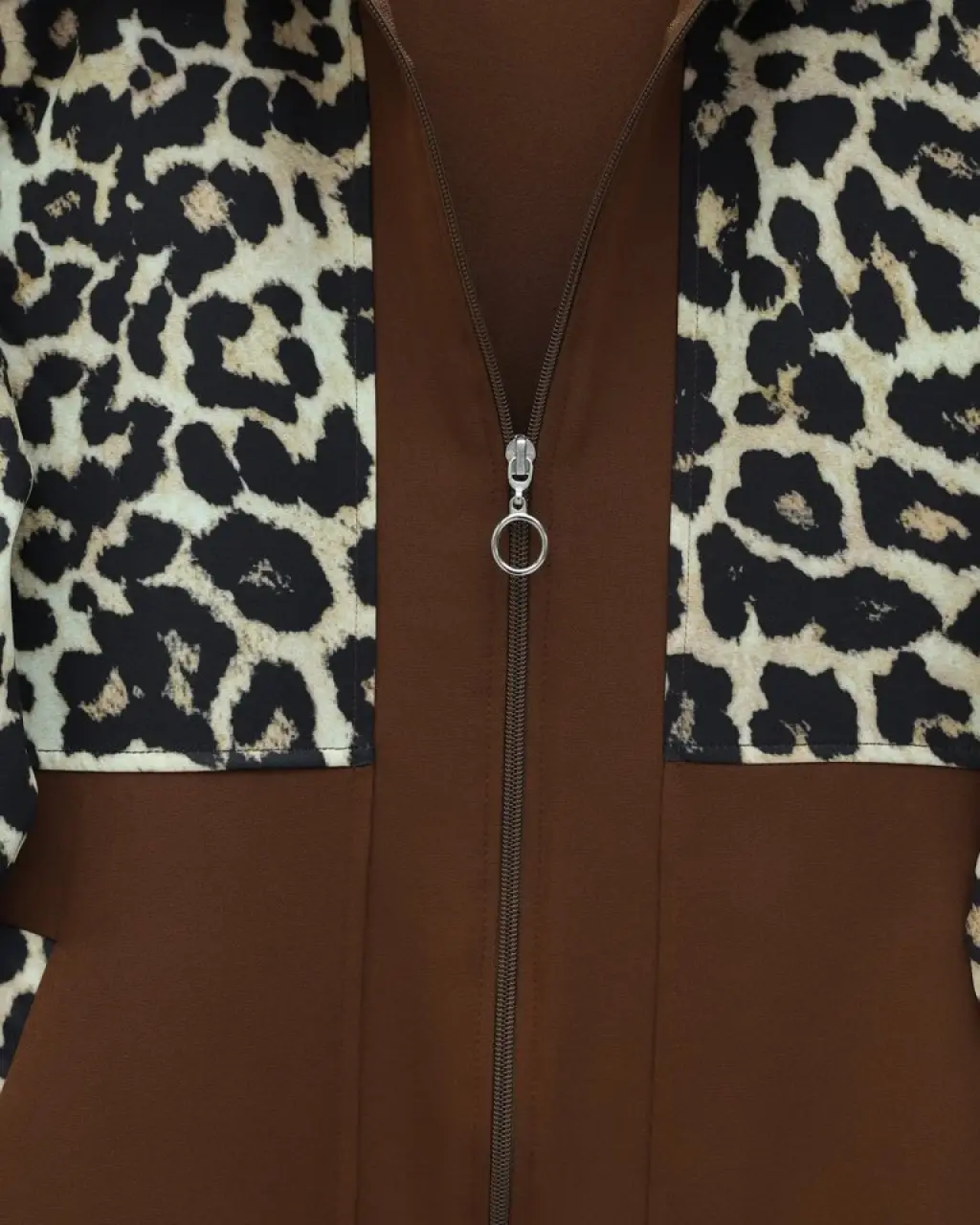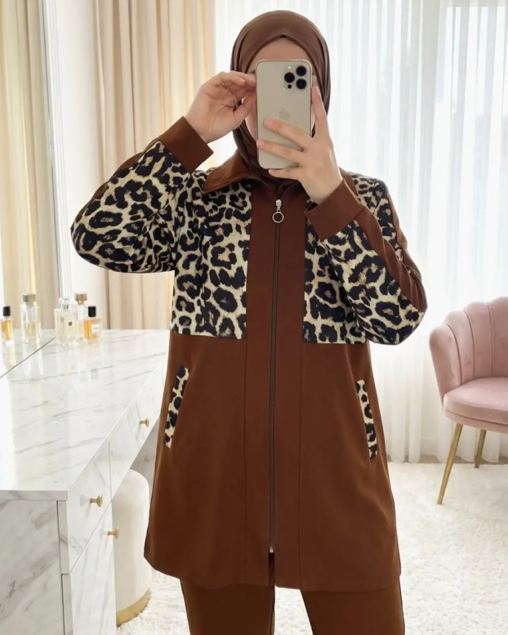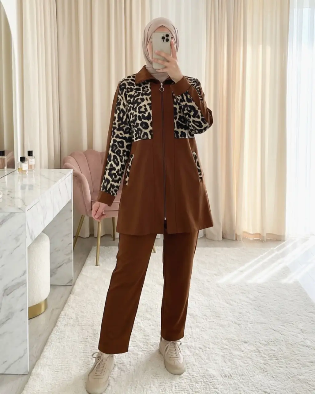 Gömlek Yaka Boydan Fermuarlı Pantolonlu Takım -Taba