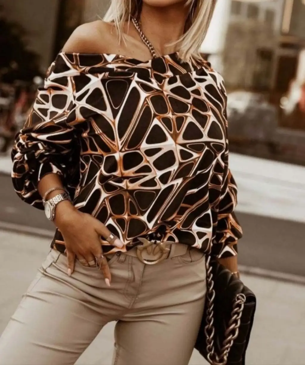 Modern Geometrik Desenli V Yaka Bluz