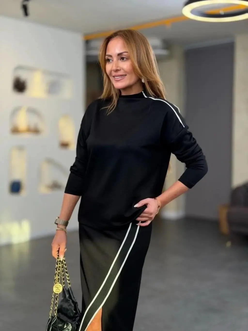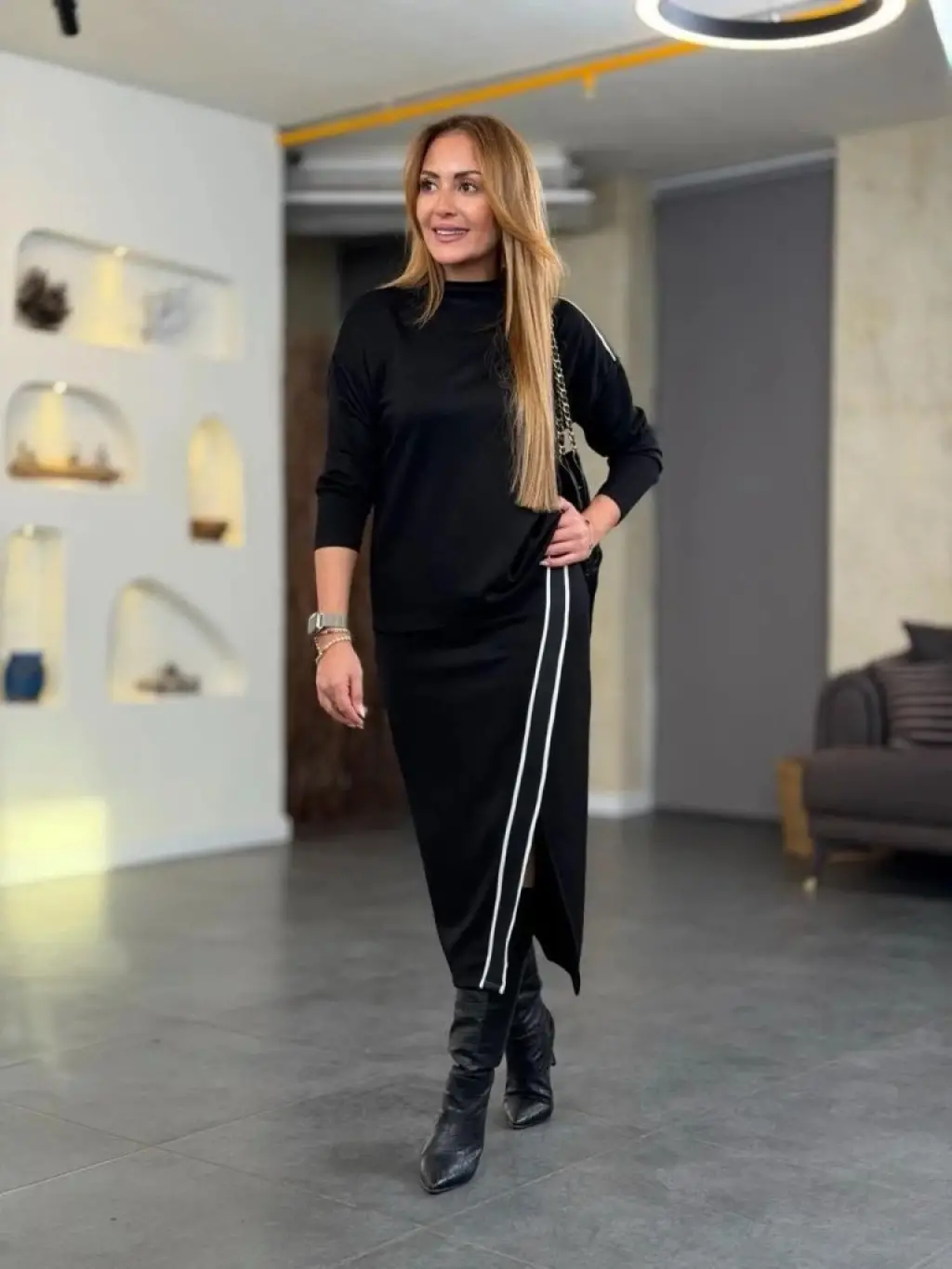Kadın Uzun Kollu Yüksek Yakalı Yan şerit Detaylı Viskon Iki Iplik Bluz Ve Etek Ikili Takım