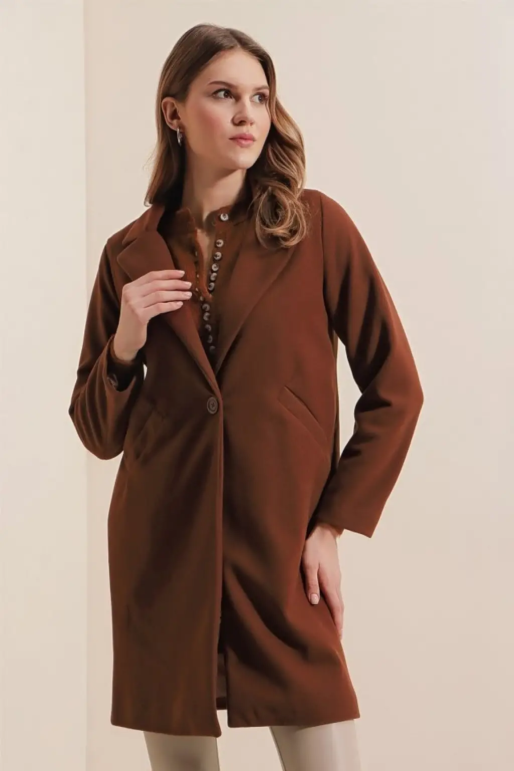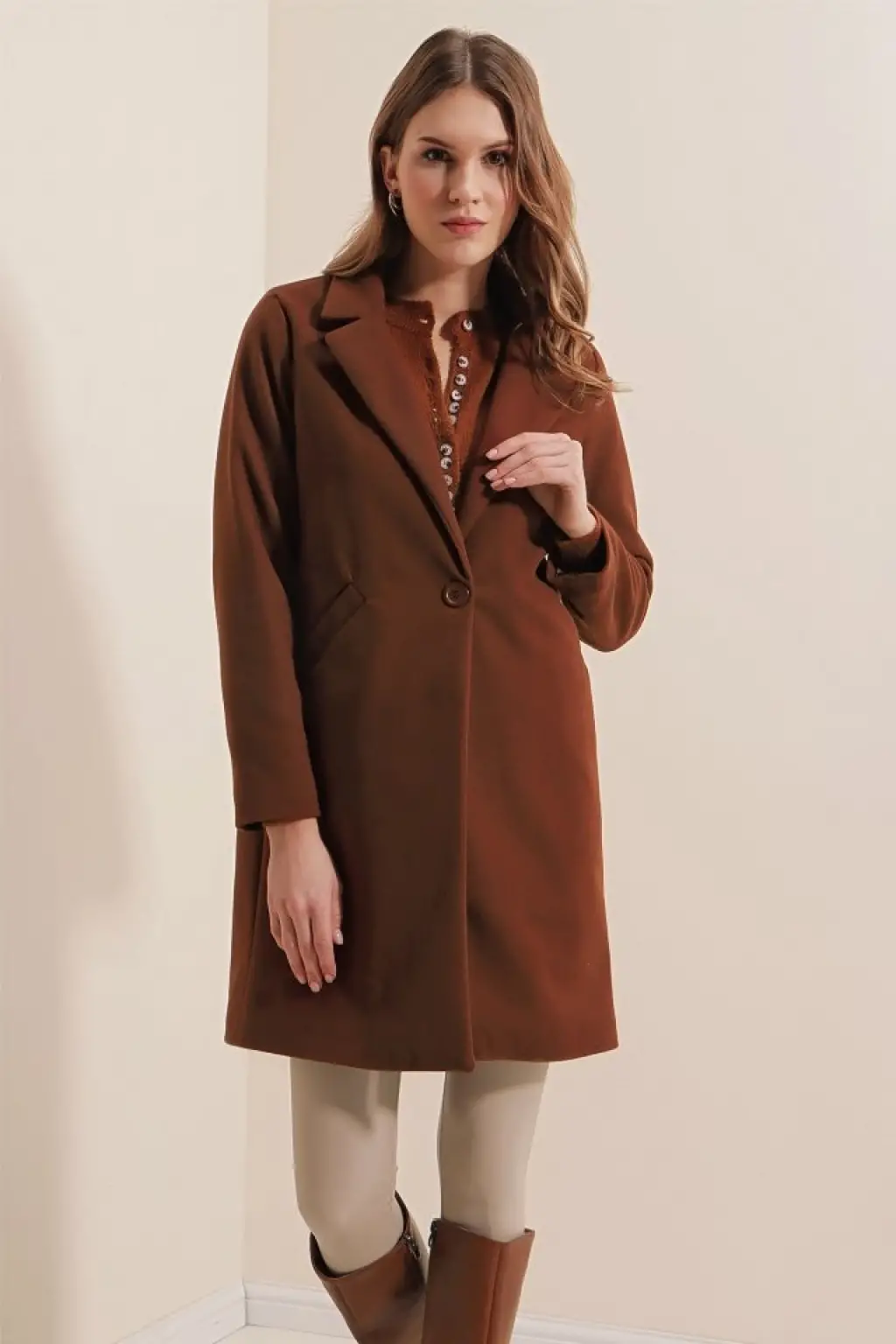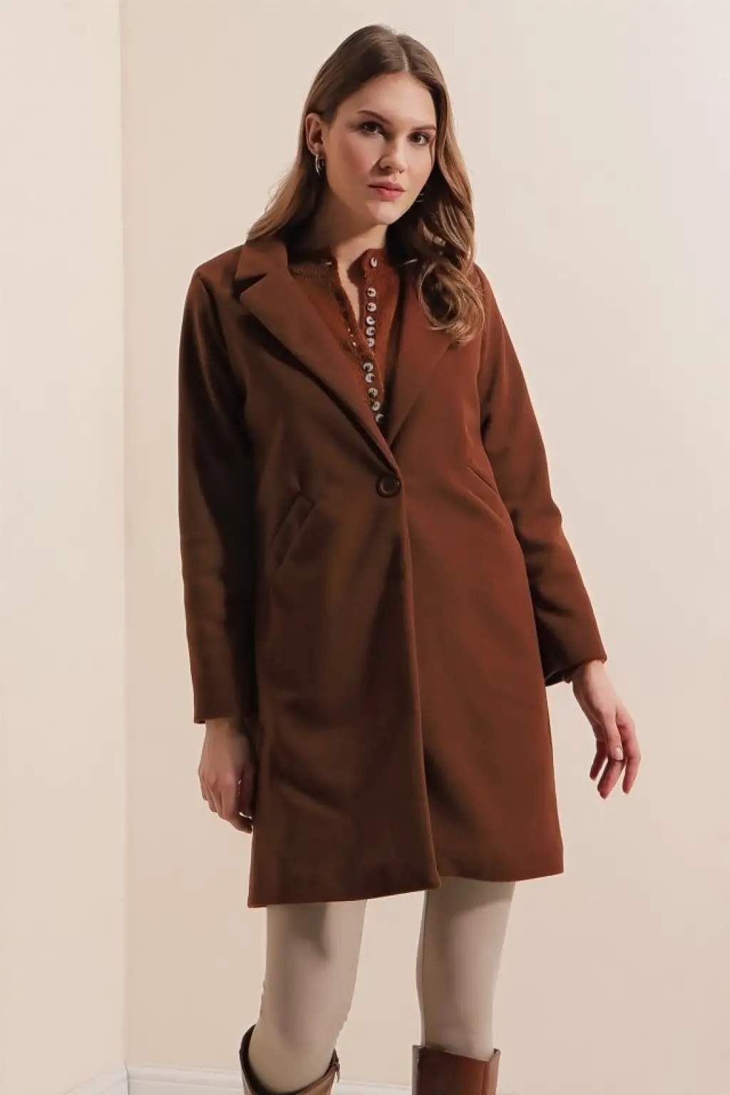 Çift Cepli Önü Düğmeli Astarlı Buklet Kaban -Bej