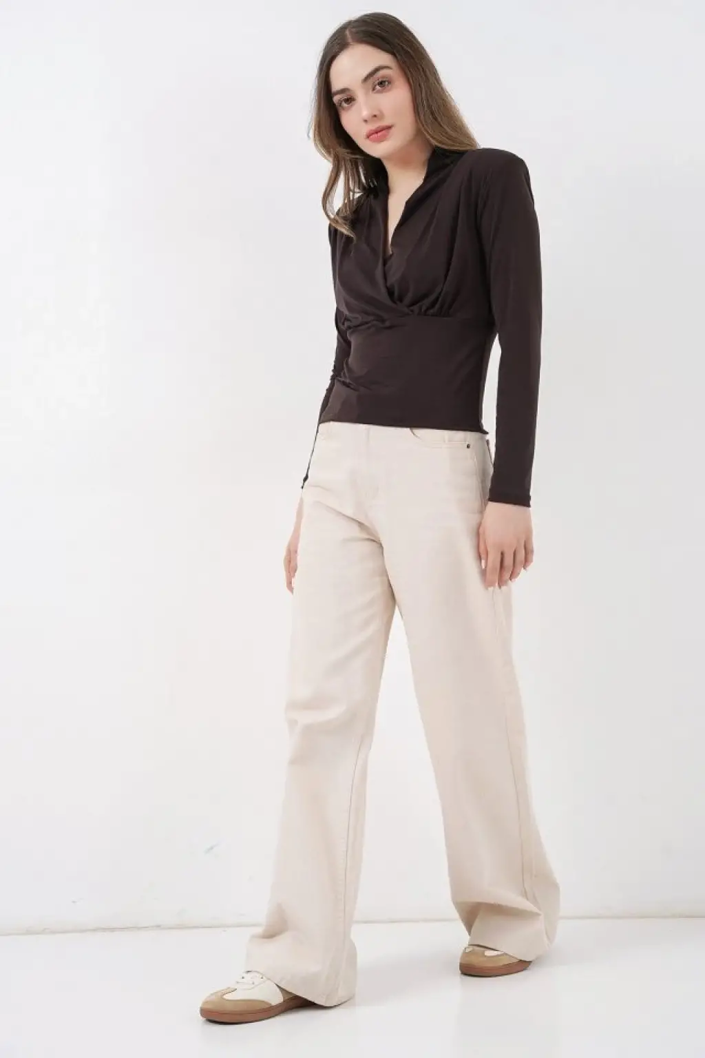Omuz Vatkalı Kruvaze Yaka Bluz 942 - Kahverengi
