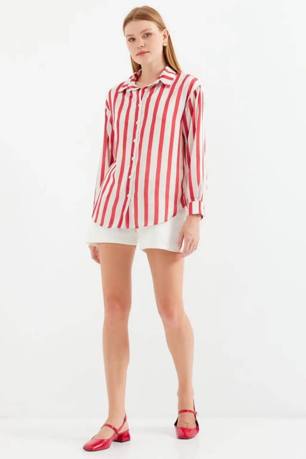 Kadın Modal Kumaş çizgili Gömlek Yaka Ikili Takım