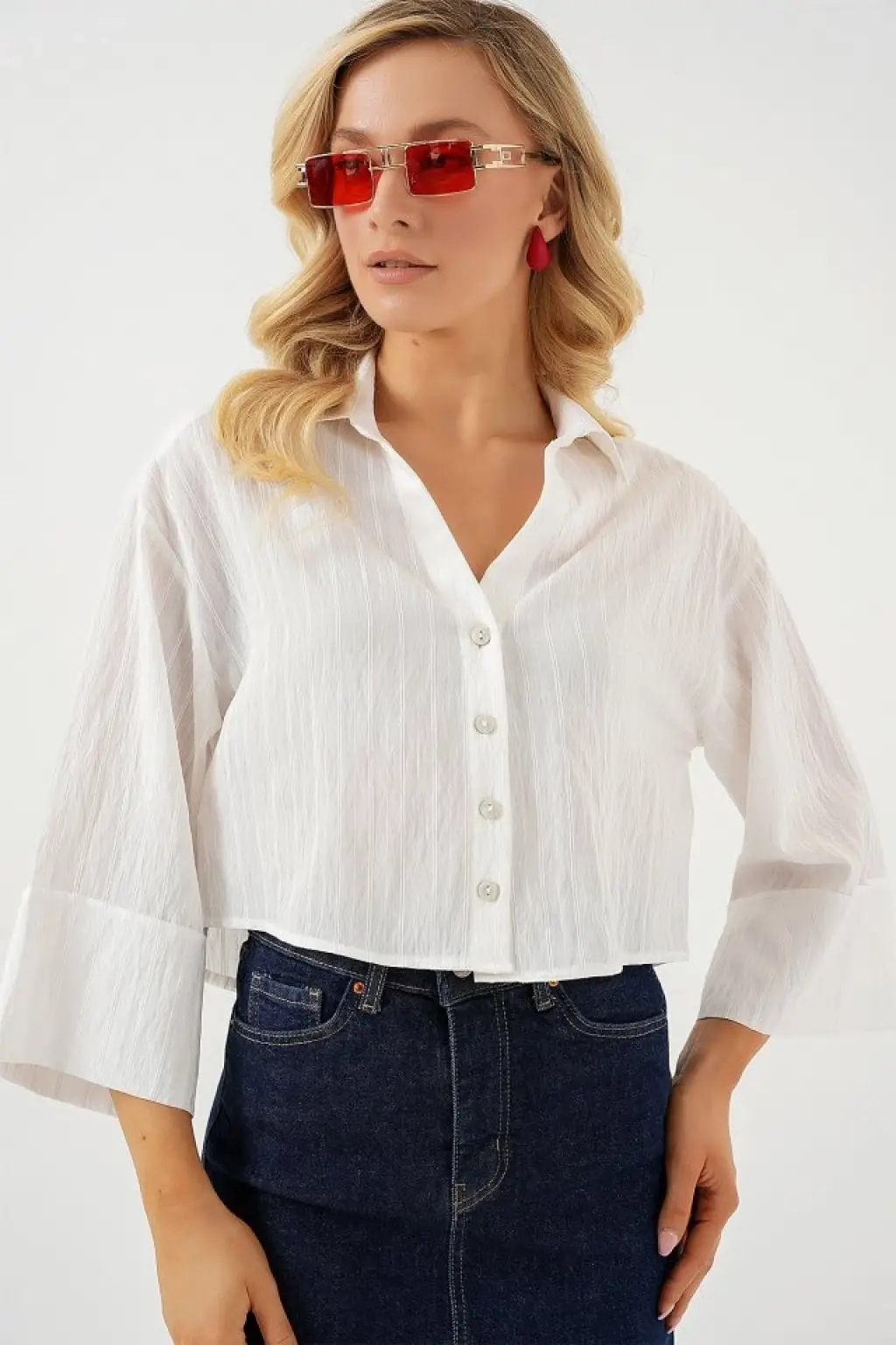 Çizgili Oversize Kısa Gömlek 20326 - Beyaz