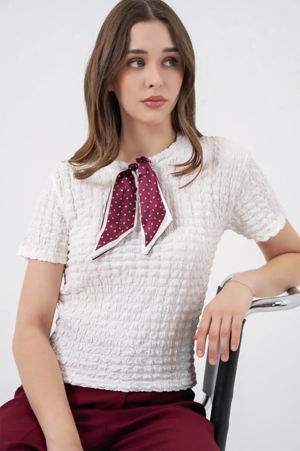 Kısa Kol Fularlı Örme Bluz 981 - Beyaz