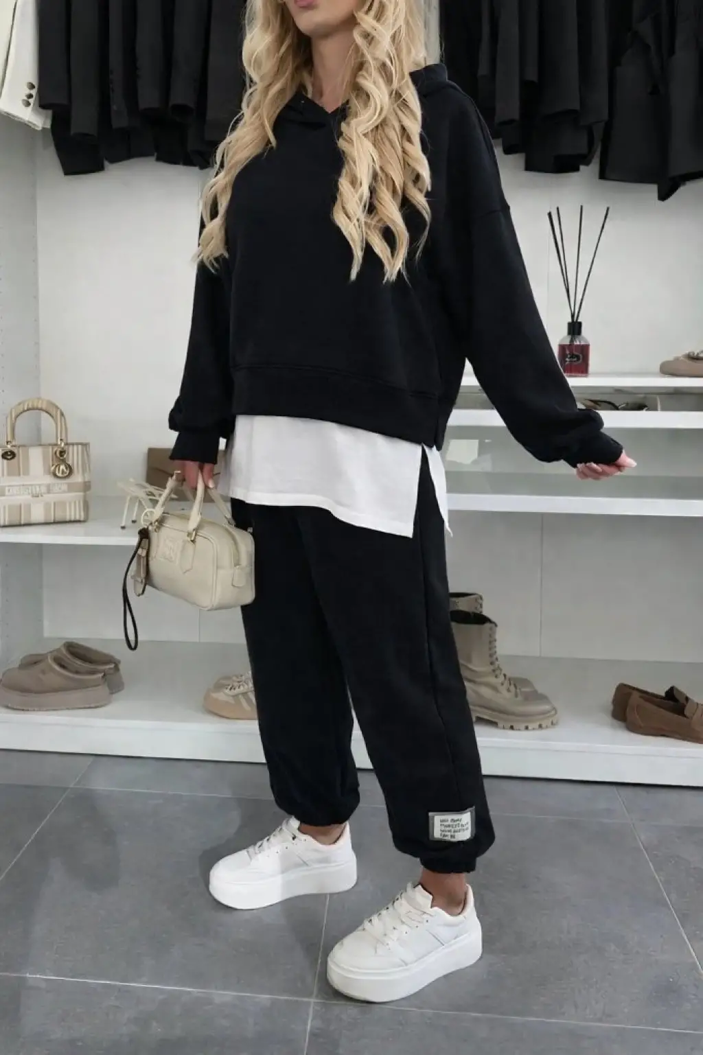 Kadın Kahve Kapşonlu Etek Ucu Detay Arma Ters Dikiş Gorunumlu Ikili Takım