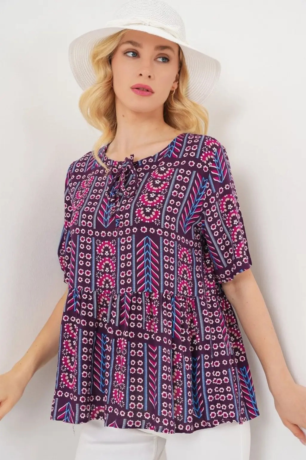 Desenli Kısa Kol Bluz 969 - Bordo