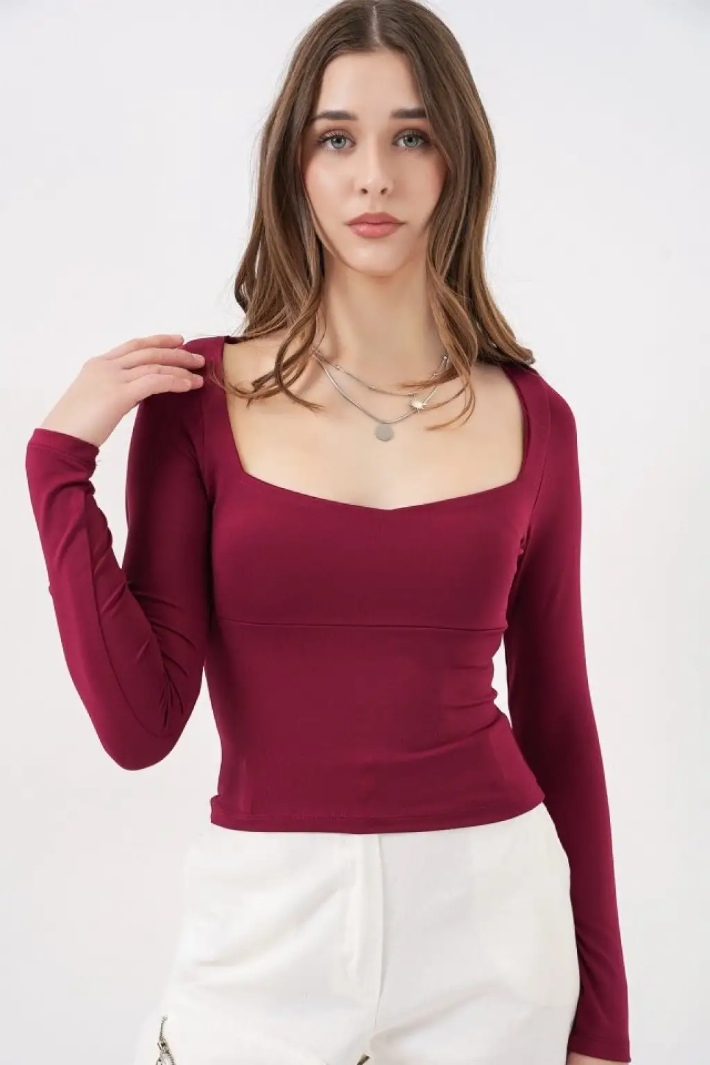 Kare Yaka Slim Fit Bluz 986 - Bordo