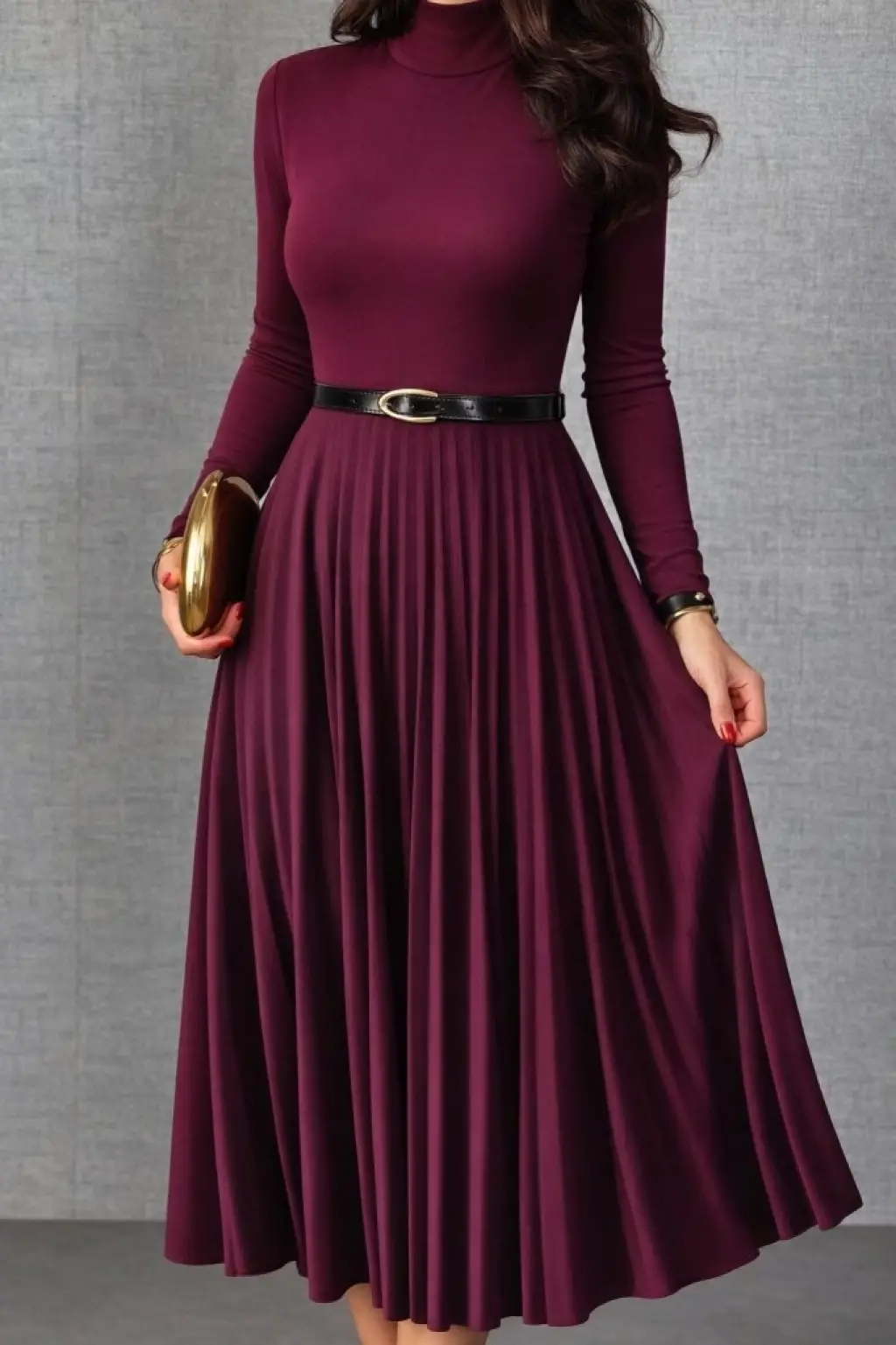 Krep Kumaş Midi Boy Kuşaklı Uzunkol Elbise 113 Cm