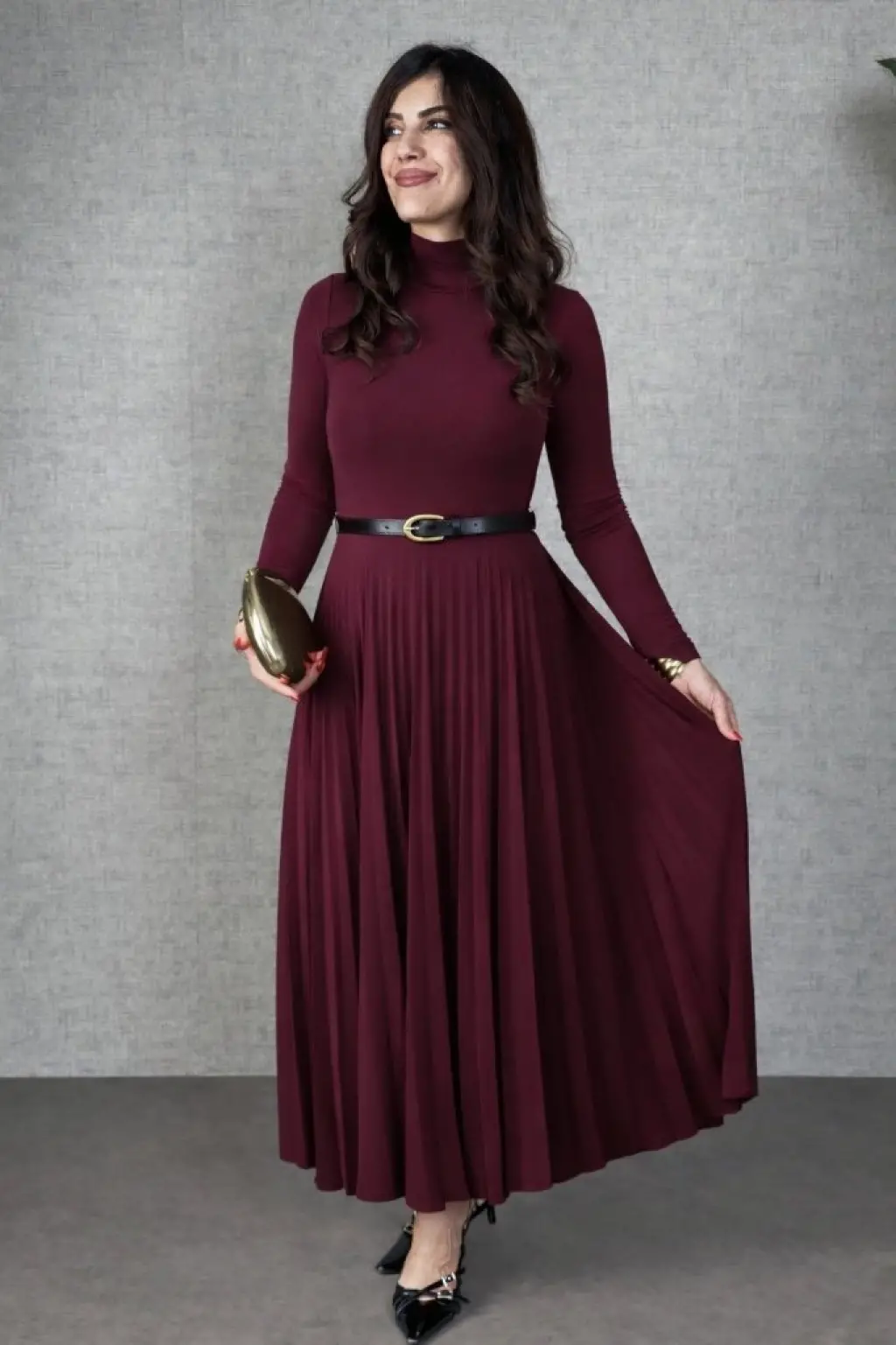 Kadın Uzun Kollu Balıkçı Yaka Kemersiz Pileli Uzun Sandy Elbise