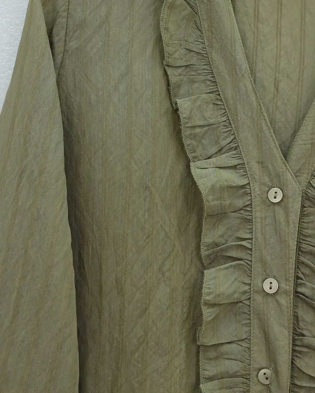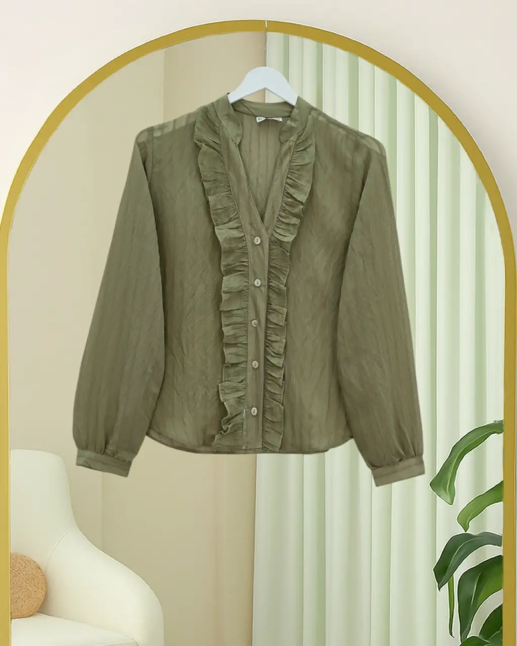 V Yaka Önü Fırfırlı Tensel Yari Transparan Buket Gömlek -Haki