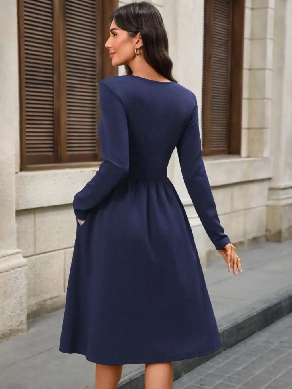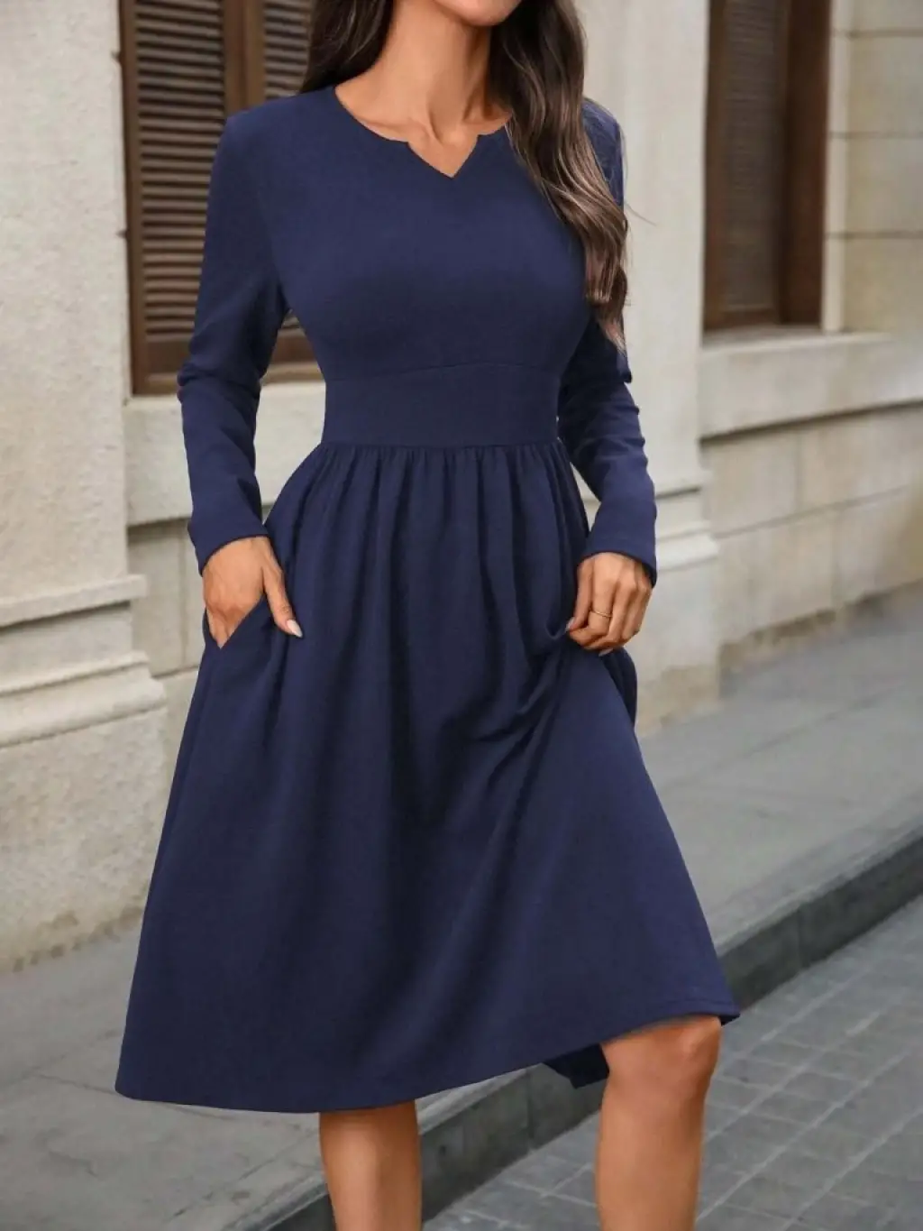 Kadın Uzun Kollu V Yakalı Cepli Midi Ithal Krep Elbise