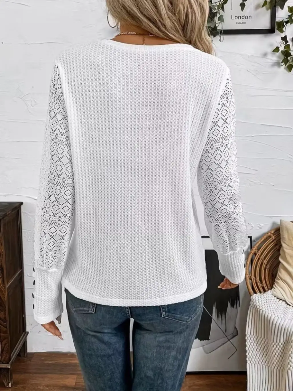 Kadın Uzun Kollu Bisiklet Yaka Kolları Tüllü Waffle Bluz