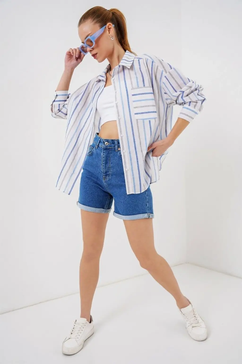 Çizgili Oversize Gömlek 20278 - Mavi