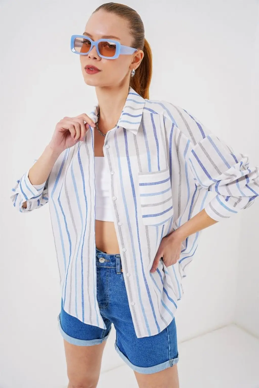 20153 Tek Cepli Oversize Keten Gömlek - Buz Mavi