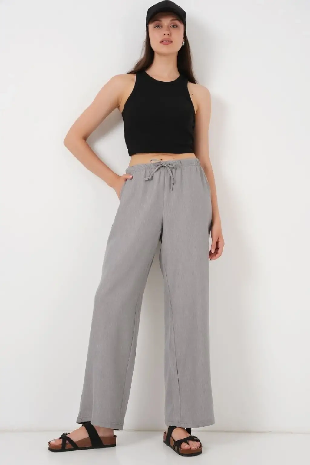 6637 Yüksek Bel Çizgili Kumaş Pantolon - Siyah
