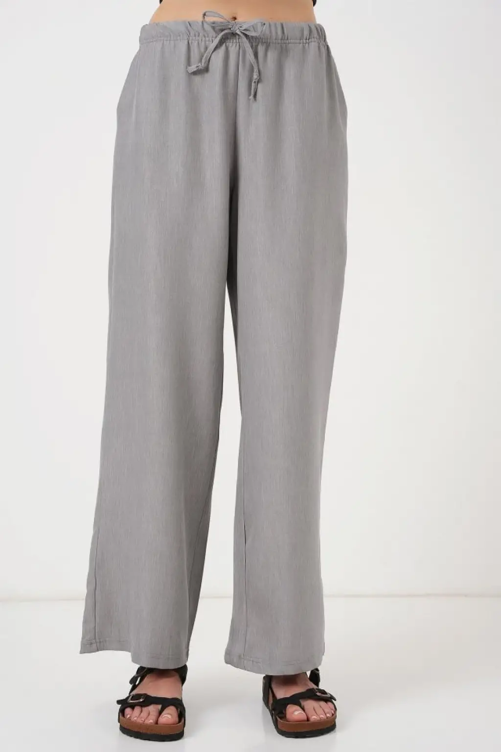 Kadın Yüksek Bel Geniş Paça Detaylı Cepli Ithal Krep Pantolon