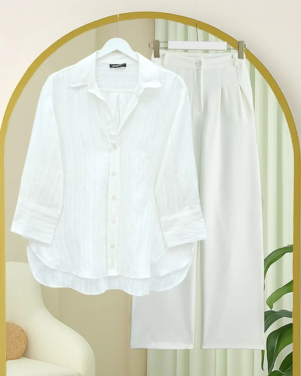 Kadın Uzun Kollu Salaş Gömlek Ve şort Keten Ikili Takım