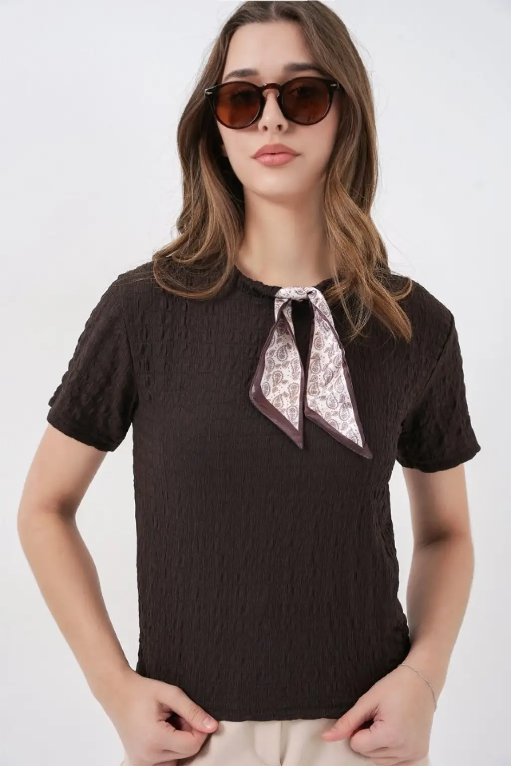 Kısa Kol Fularlı Örme Bluz 981 - Kahverengi