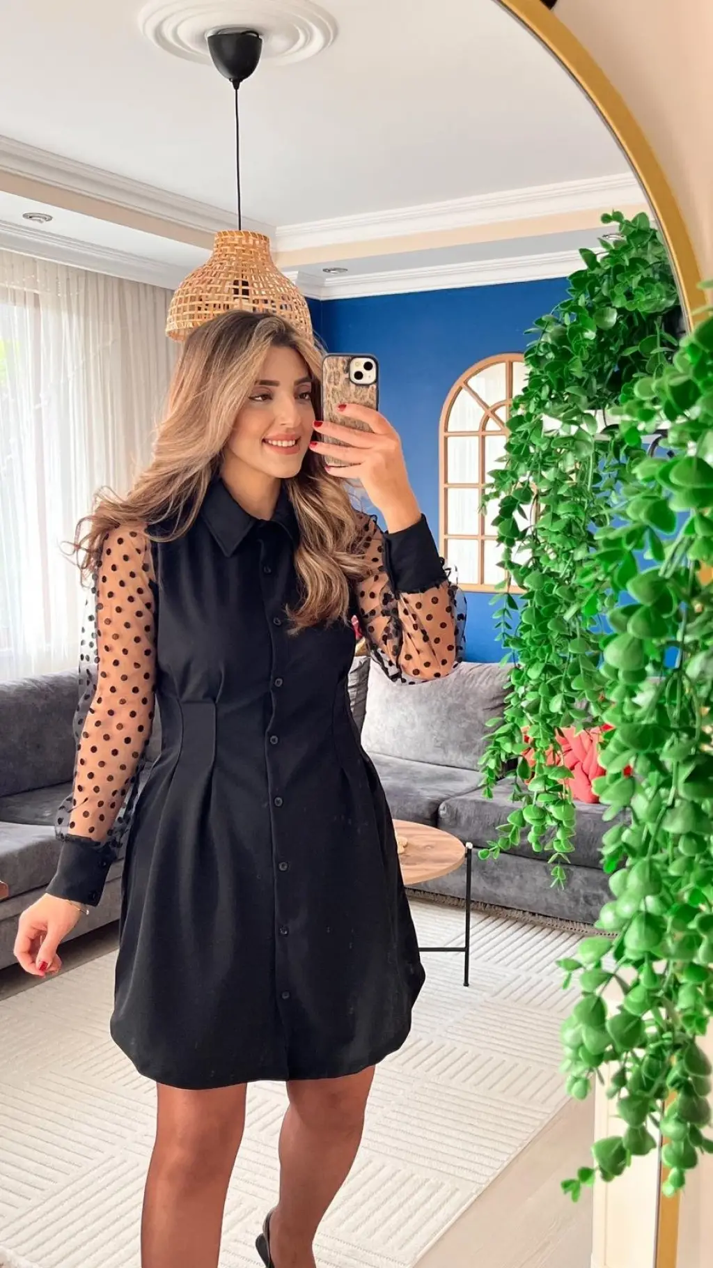 Kadın Uzun Kollu Yakalı Düğmeli Mini Ithal Krep Elbise