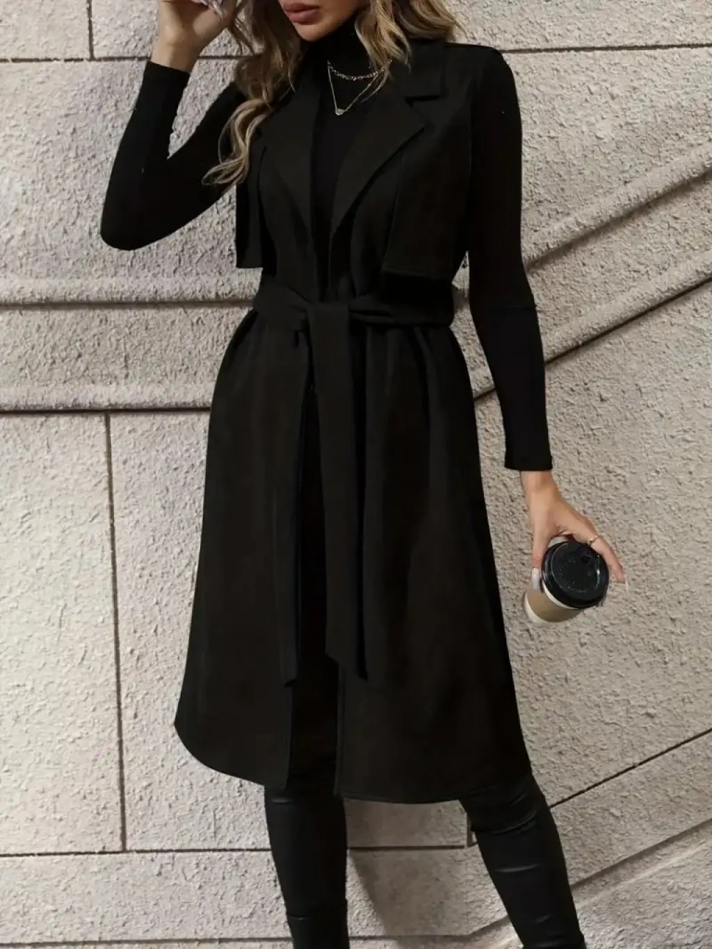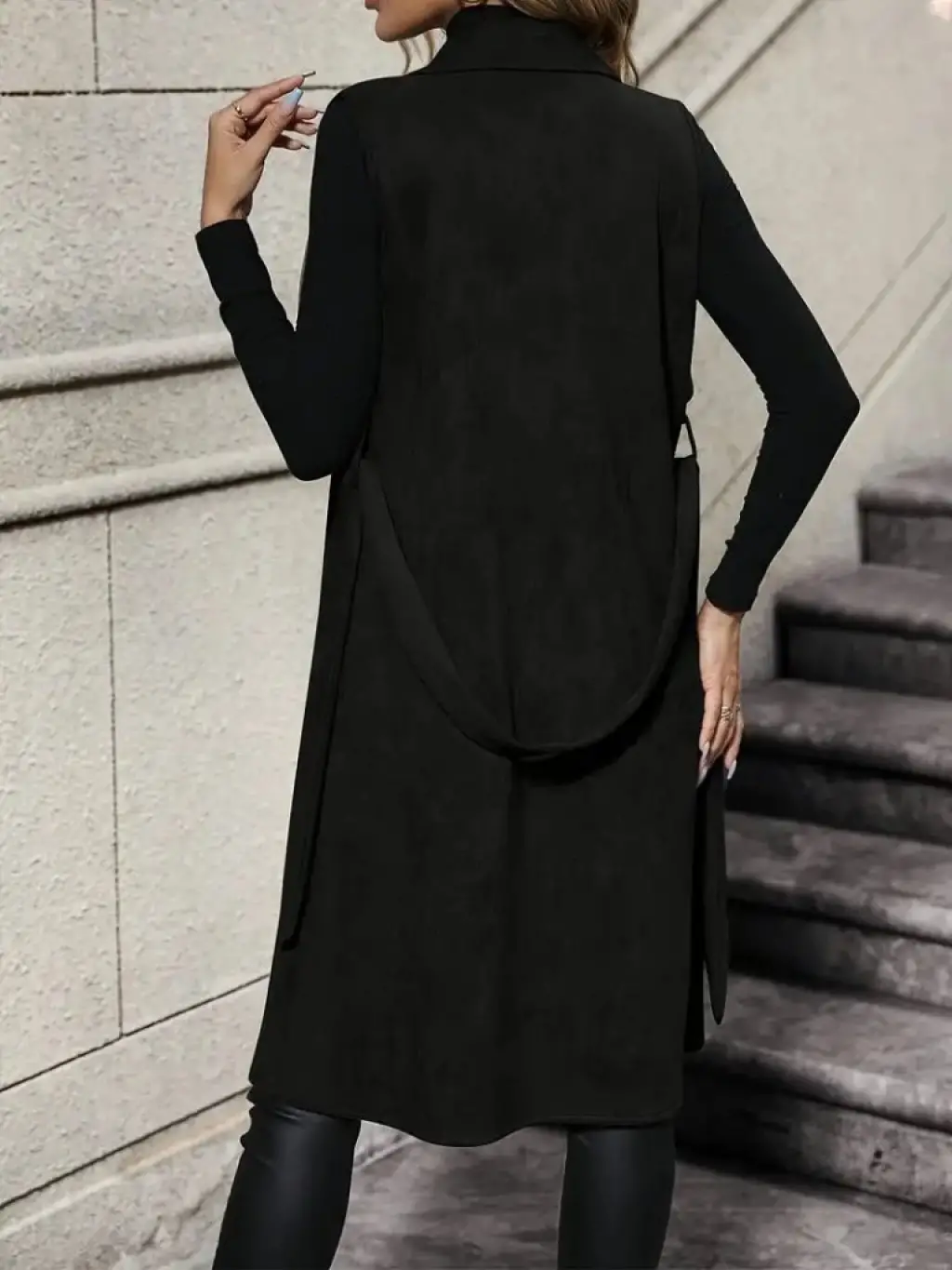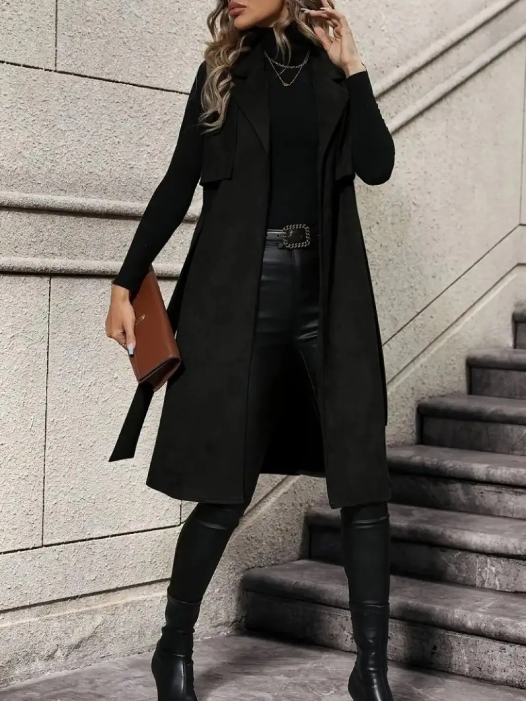 Kadın Kolsuz Yakalı önü Açık Belden Kuşaklı Süet Midi Yelek