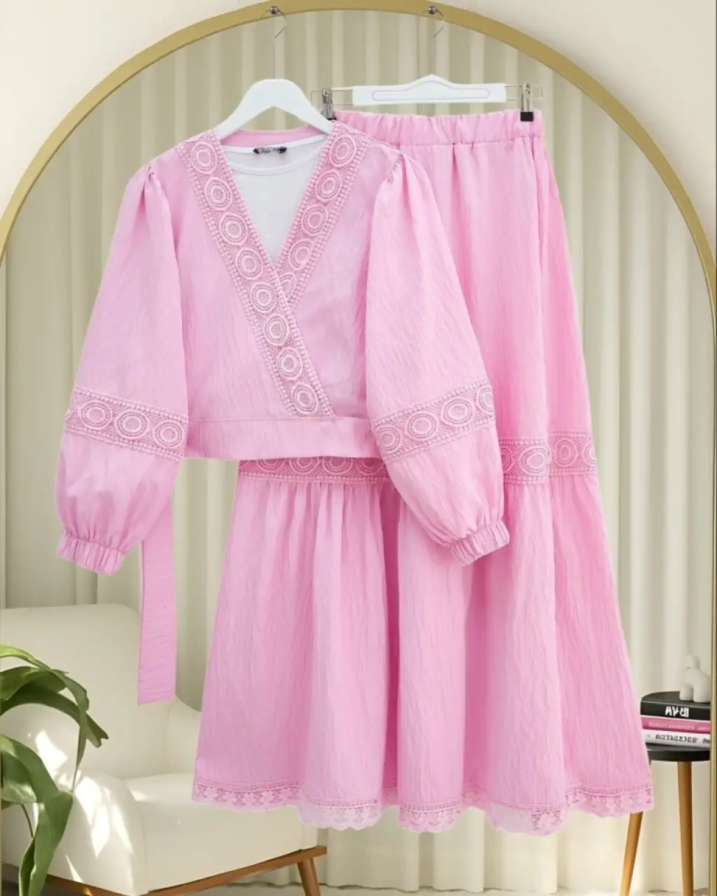 Dantel Detaylı Bağlamalı Kolu Lastikli Kraş Etekli Takım -Pembe