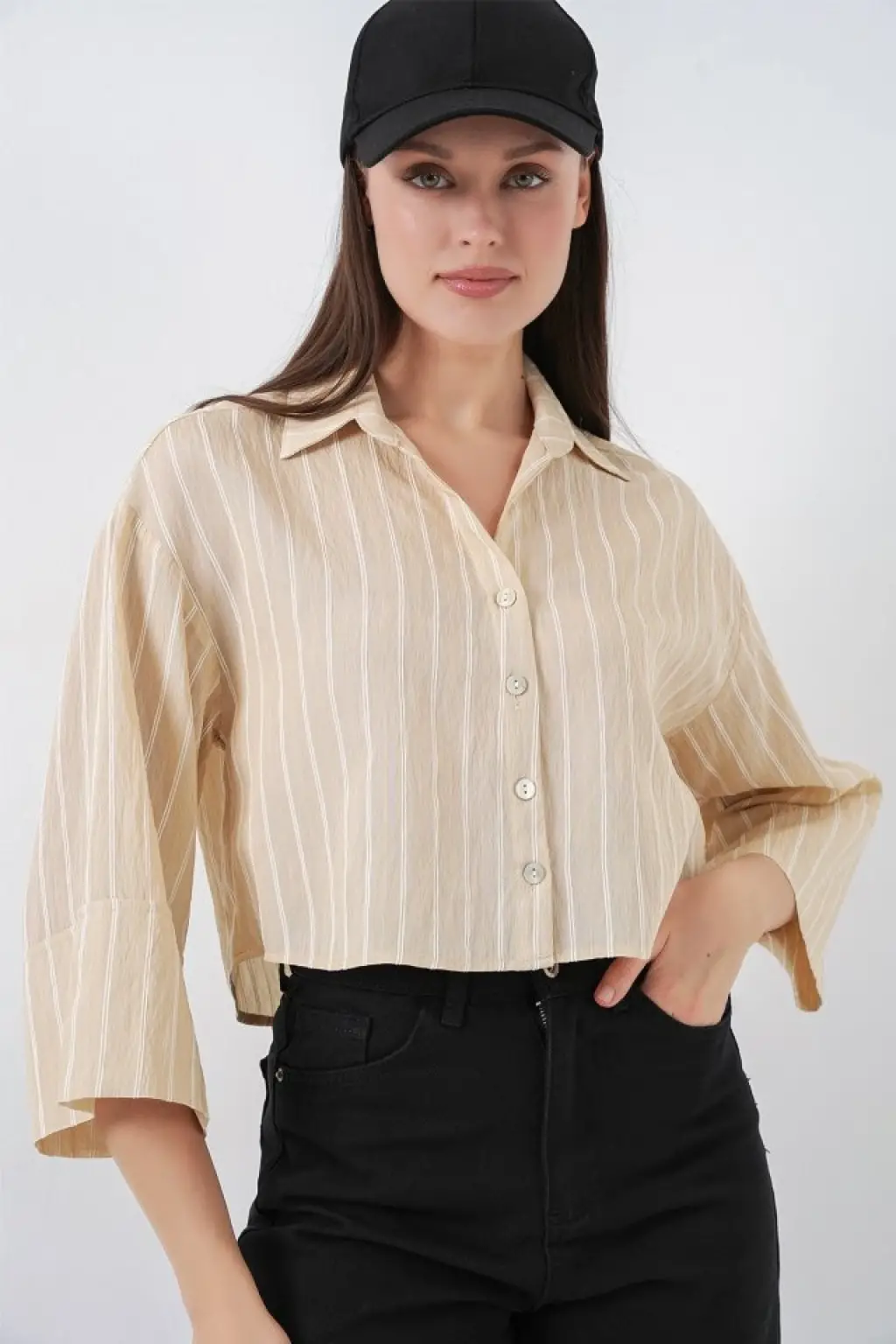 Çizgili Oversize Kısa Gömlek 20326 - Bej