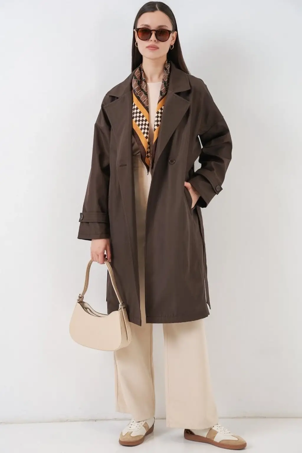 5941 Kruvaze Yaka Uzun Trençkot - Kahverengi