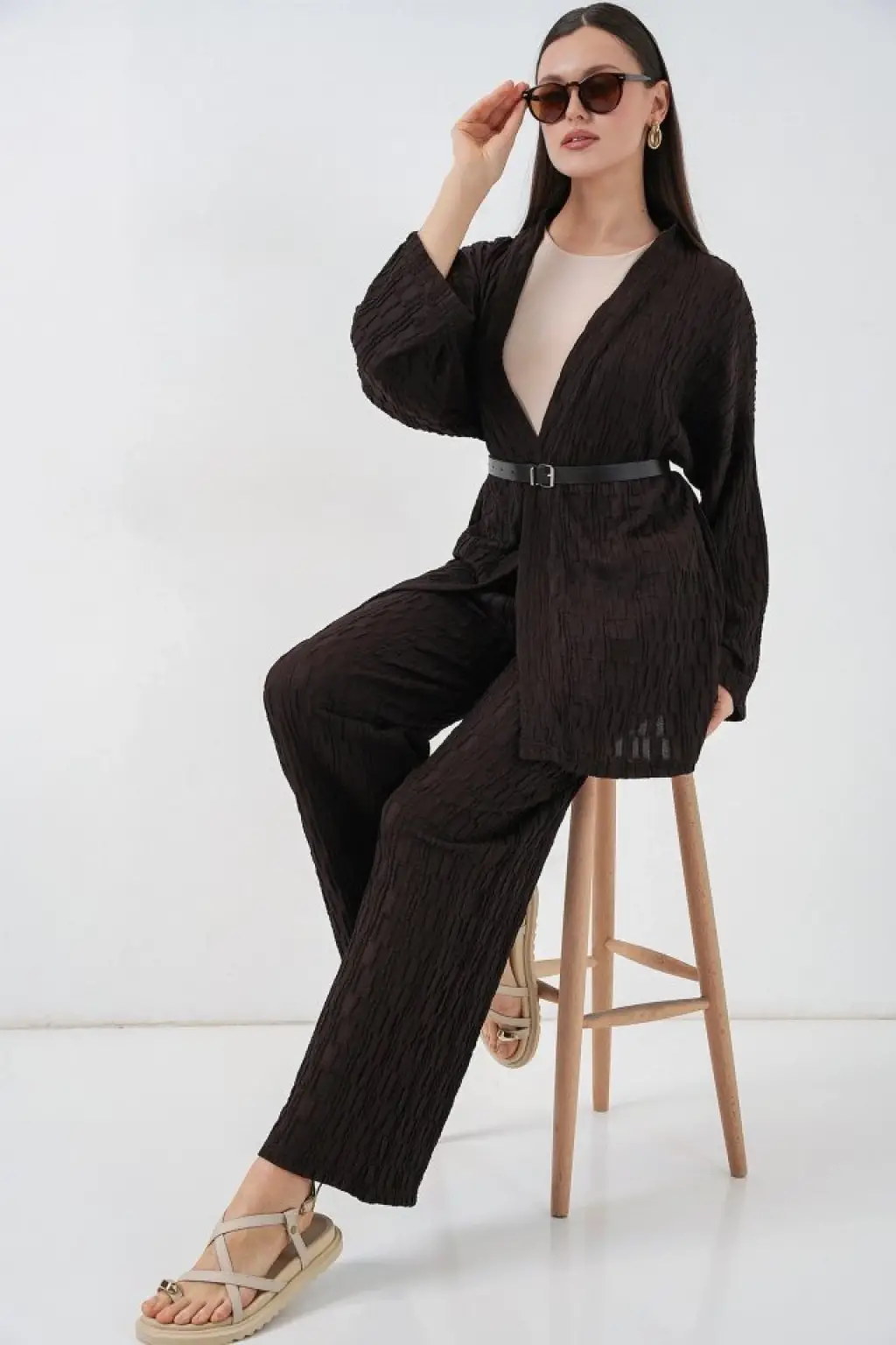 Kimono Pantolon Kumaş Takım 30054 - Kahverengi