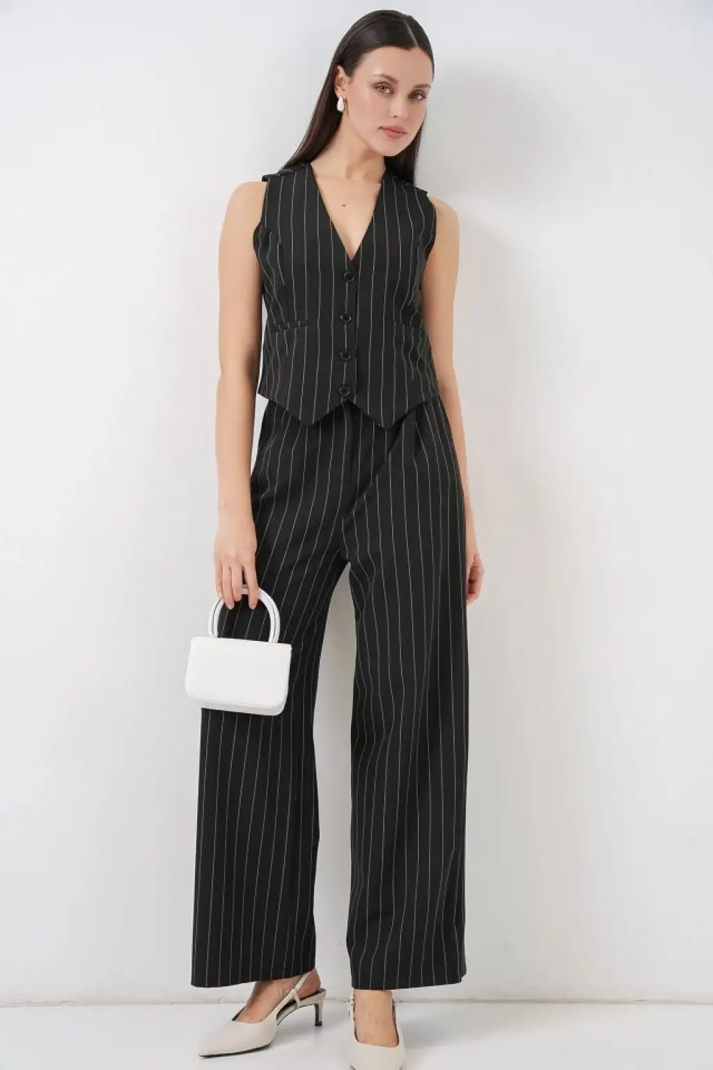 Kadın Sıfır Kollu çapraz V Yakalı önden Düğmeli Atlas Yelek Ve Pantolon Ikili Takım
