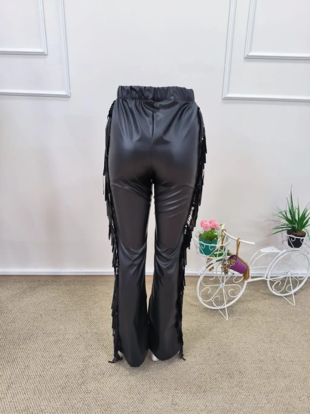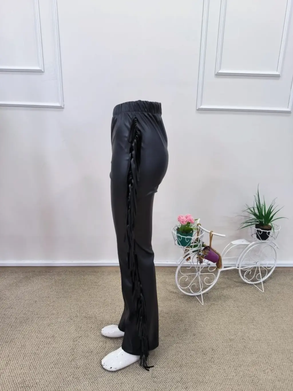 Kadın Yüksek Bel Yanlardan Püsküllü Deri Pantolon