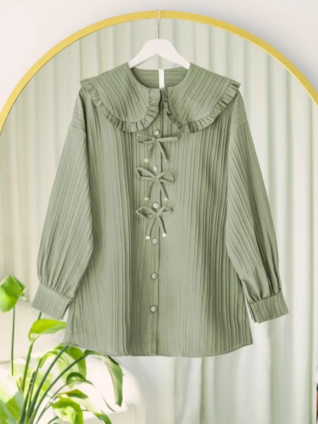 Önü Kurdele Detaylı Düğmeli Önlük Yaka Gömlek -Çağla Y.
