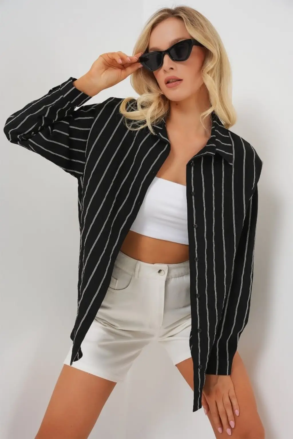 Çizgili Oversize Gömlek 20293 - Siyah