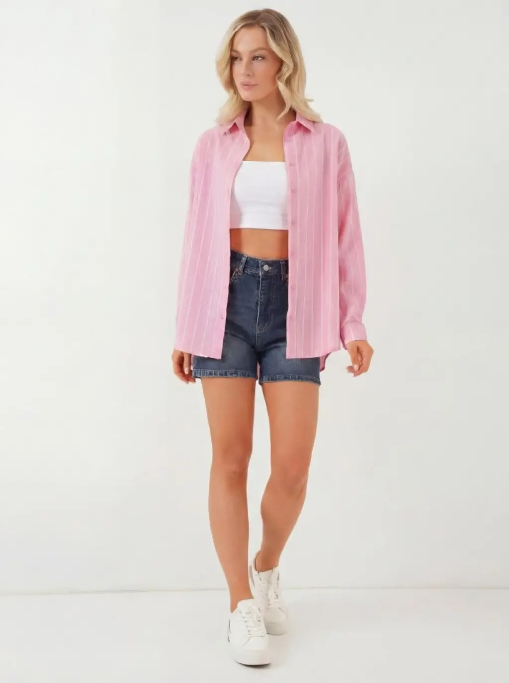 Çizgili Oversize Gömlek 20293 - Pembe