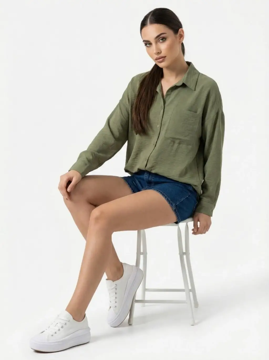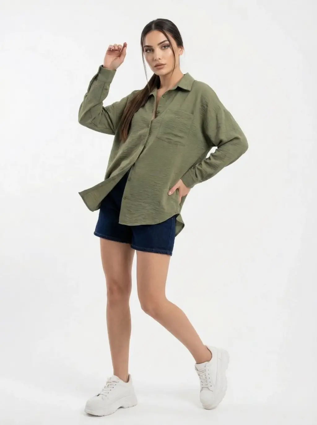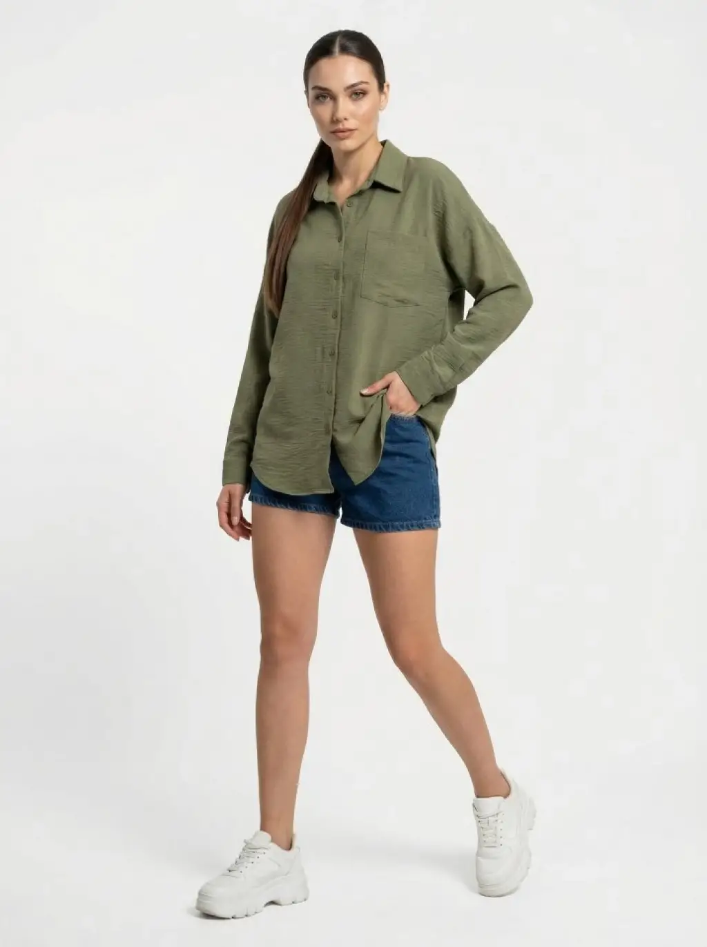 20153 Tek Cepli Oversize Keten Gömlek - A.Haki