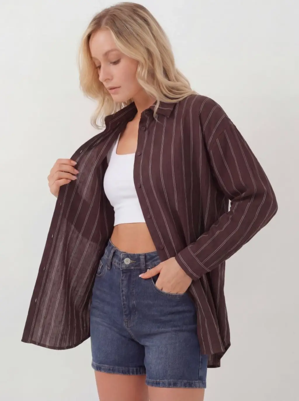 Çizgili Oversize Gömlek 20293 - Kahverengi