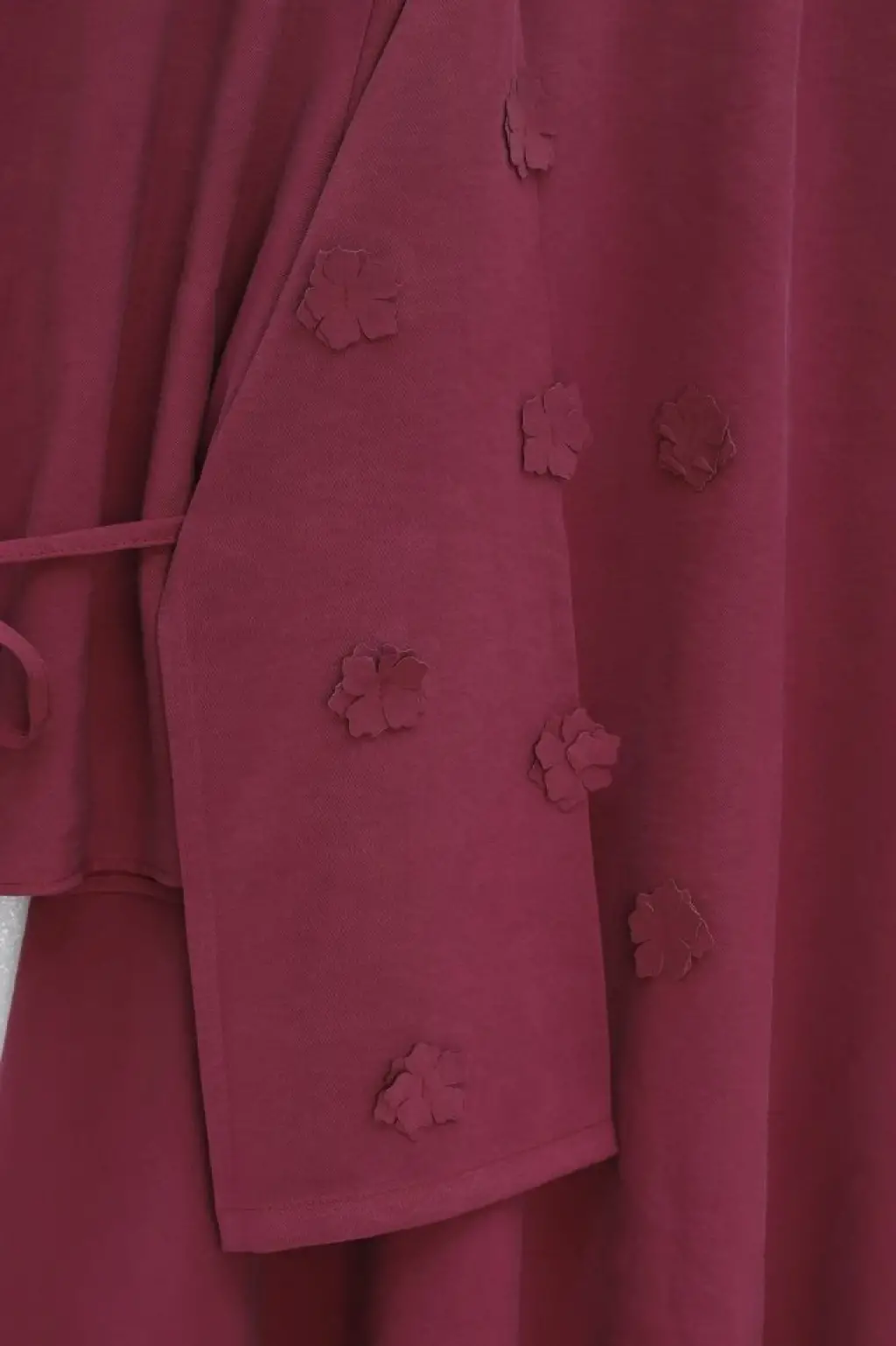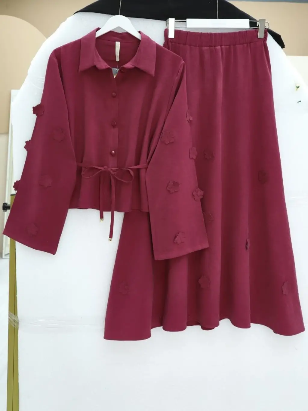 Kolları Ve Eteği Çiçekli Beli Bağcıklı Gömlek Etek İkili Modal Takım -Mürdüm