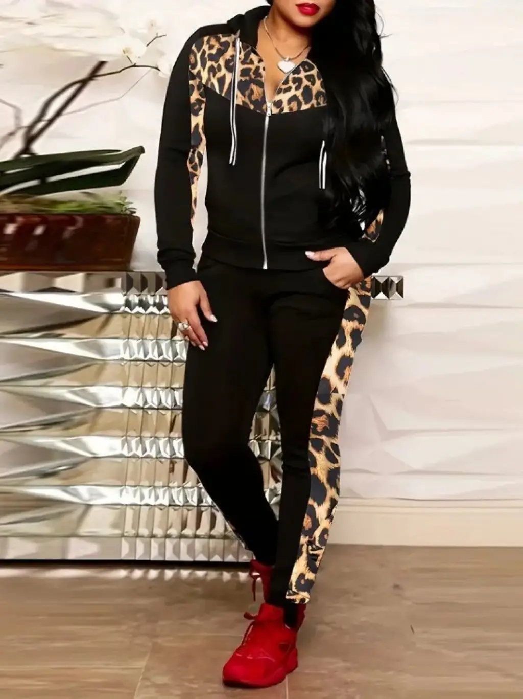 Kadın Uzun Kollu Omuzlardan Açık Kapşonlu Bağcıklı çift Renkli Viskon Iki Iplik Bluz Ve Pantolon Ikili Takım
