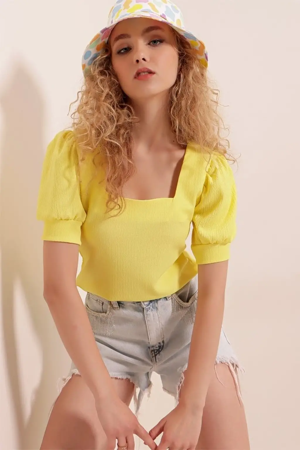 0409 Kare Yaka Örme Bluz - Sarı