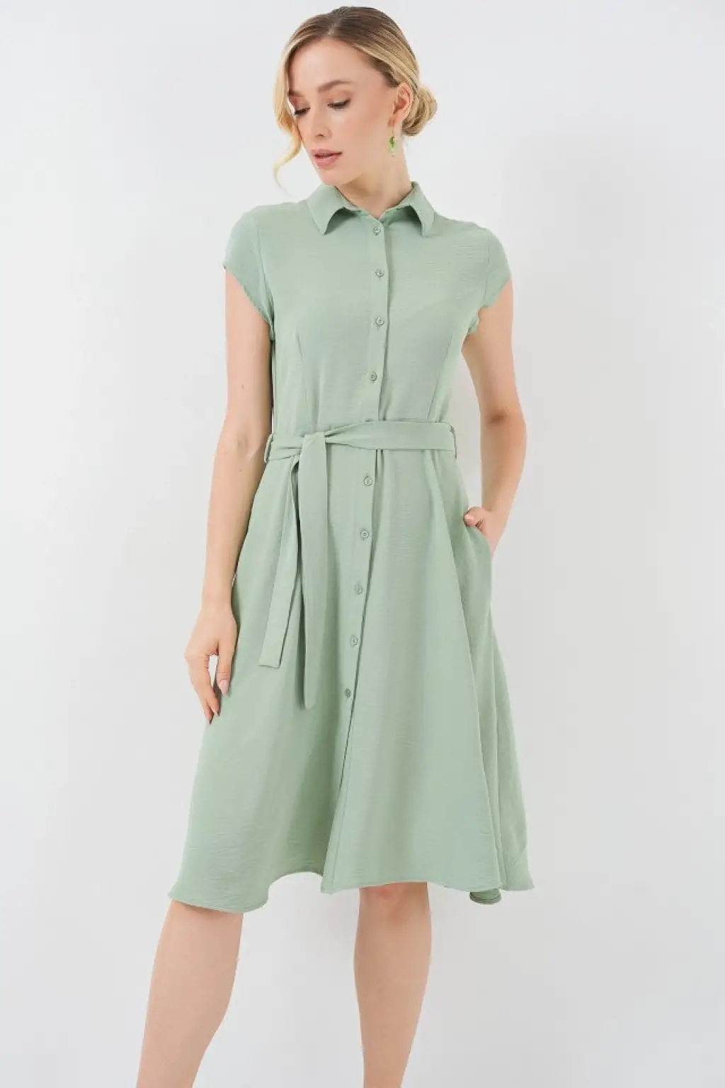 1677 Boydan Düğmeli Kuşaklı Elbise - E.Yeşil