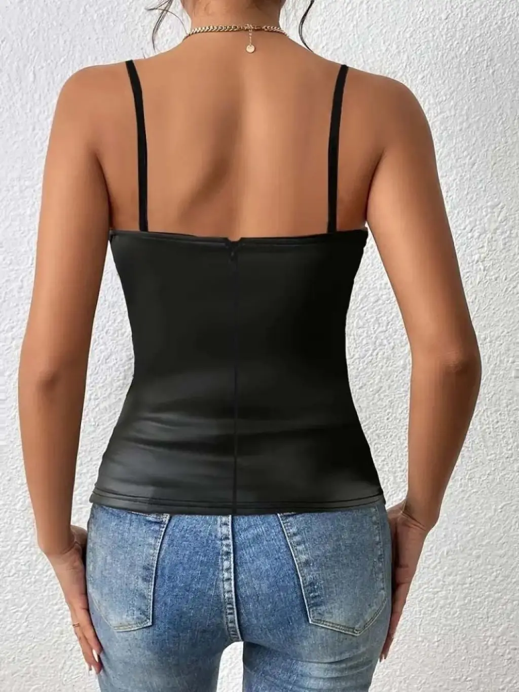 Kadın Ip Askılı Geniş V Yakalı Deri Bluz