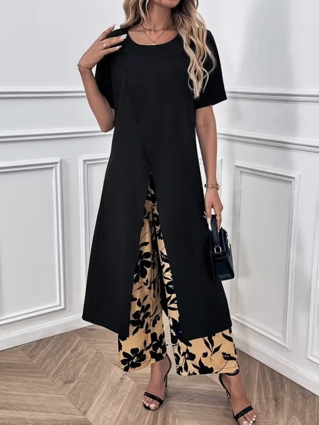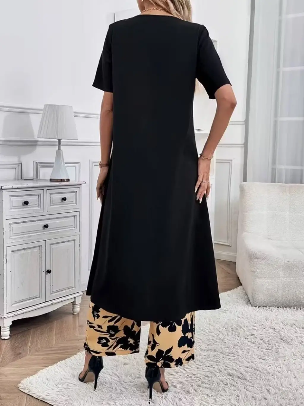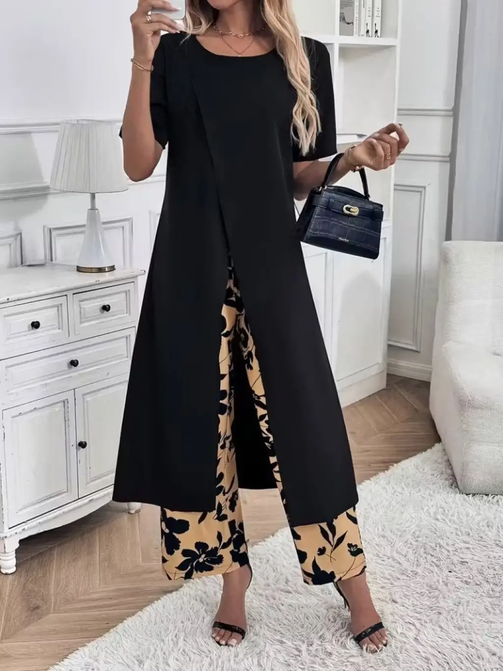 Kadın Kısa Kollu önden çapraz Detaylı Viskon Uzun Bluz Ve Desenli Iki Iplik Pantolon Ikili Takım