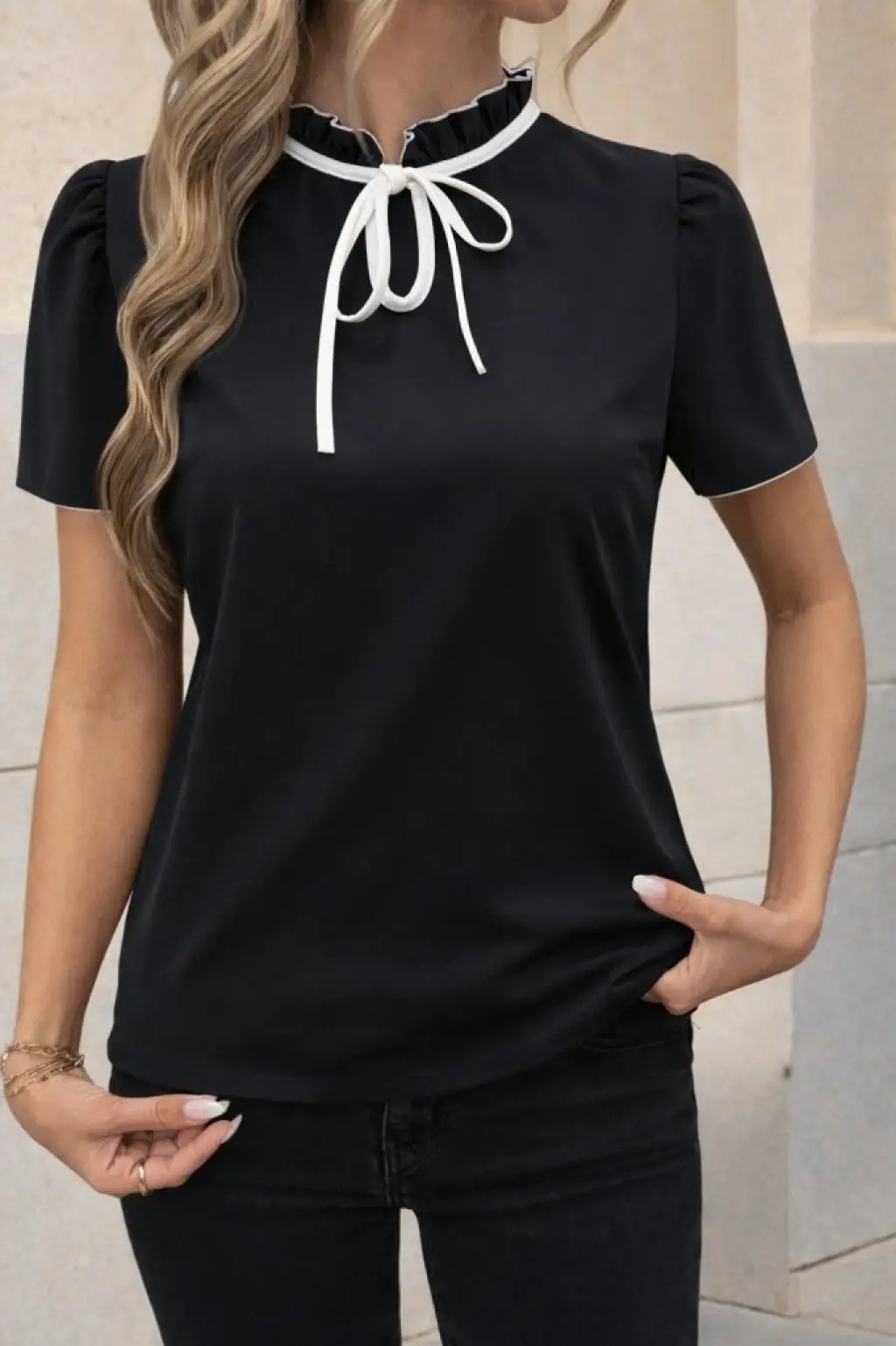 Kadın Kısa Kollu Yakası Fırfırlı Bağcıklı Janjan Krep Bluz