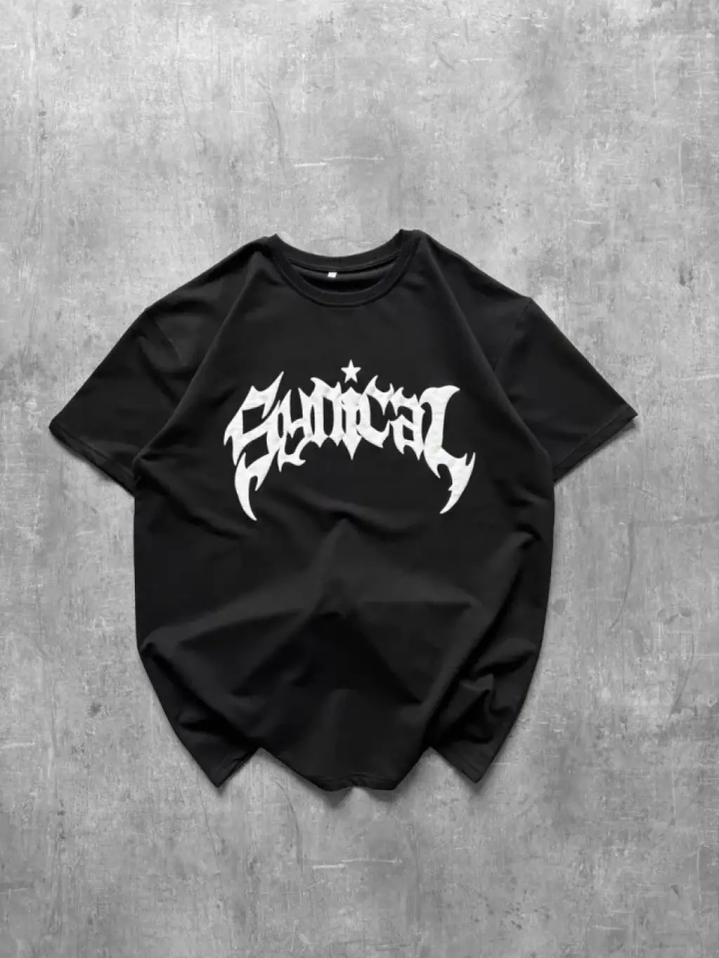 Bisiklet Yaka Ön Baskılı Kısa Kollu Tişört Streetwear Günlük Basic Pamuklu T-shirt - Siyah