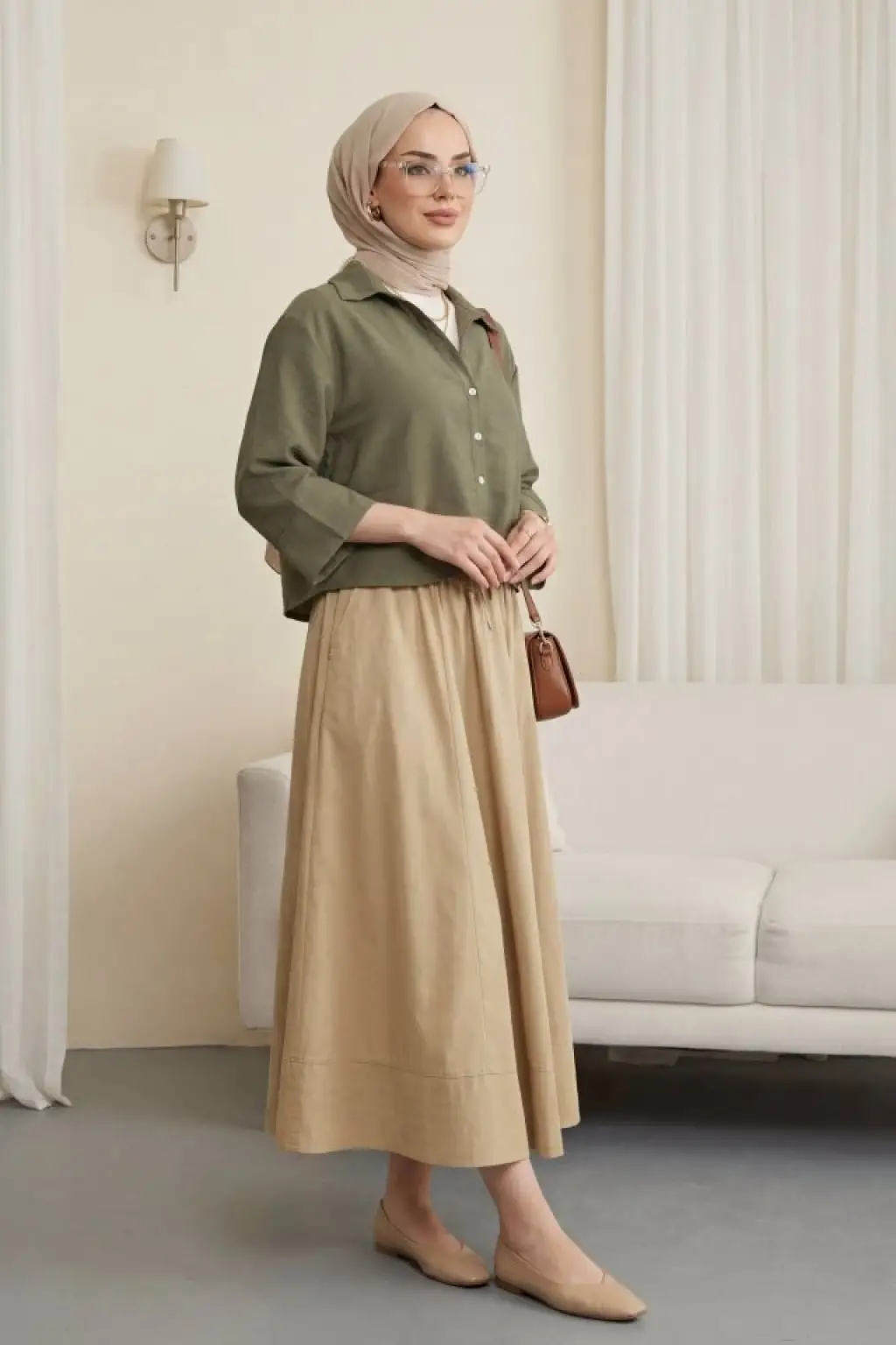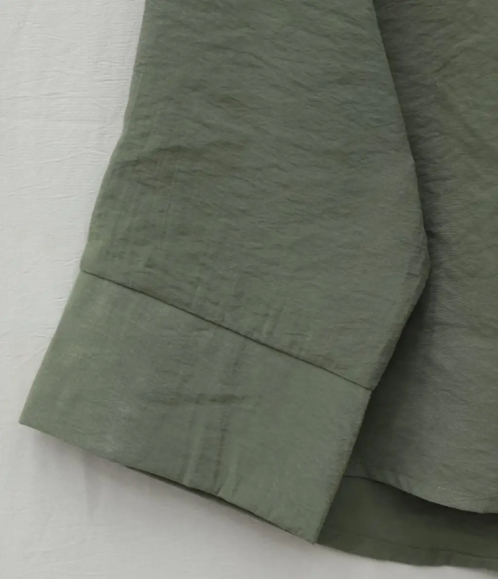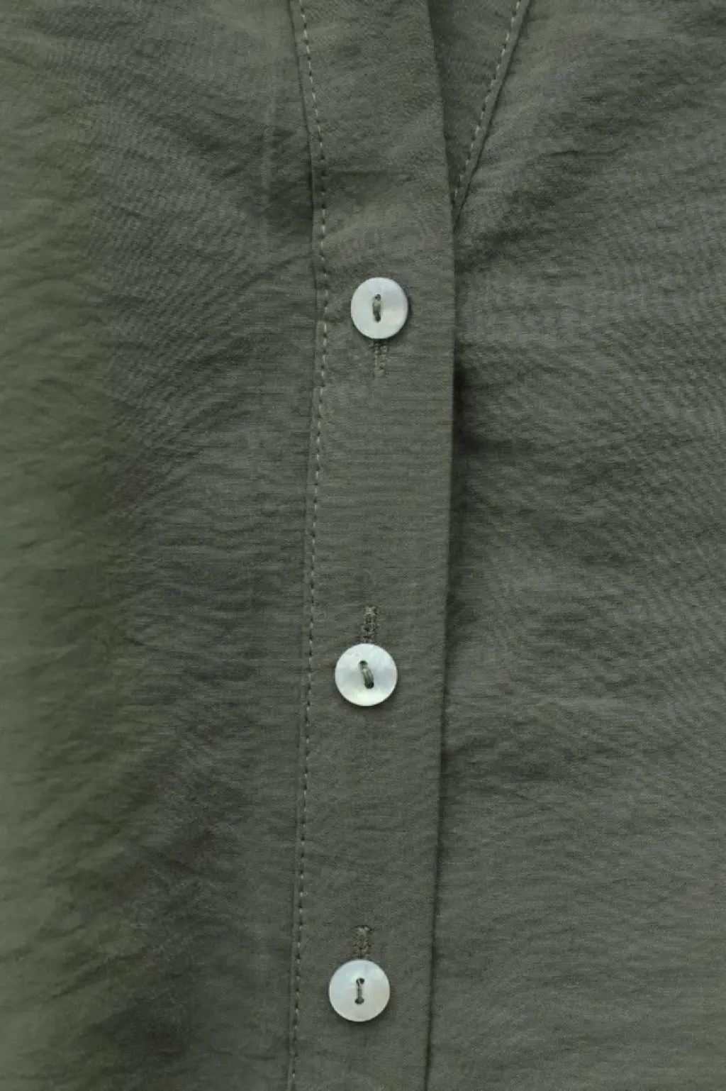V Yaka Düğmeli Yarım Kol Modal Gömlek -Haki