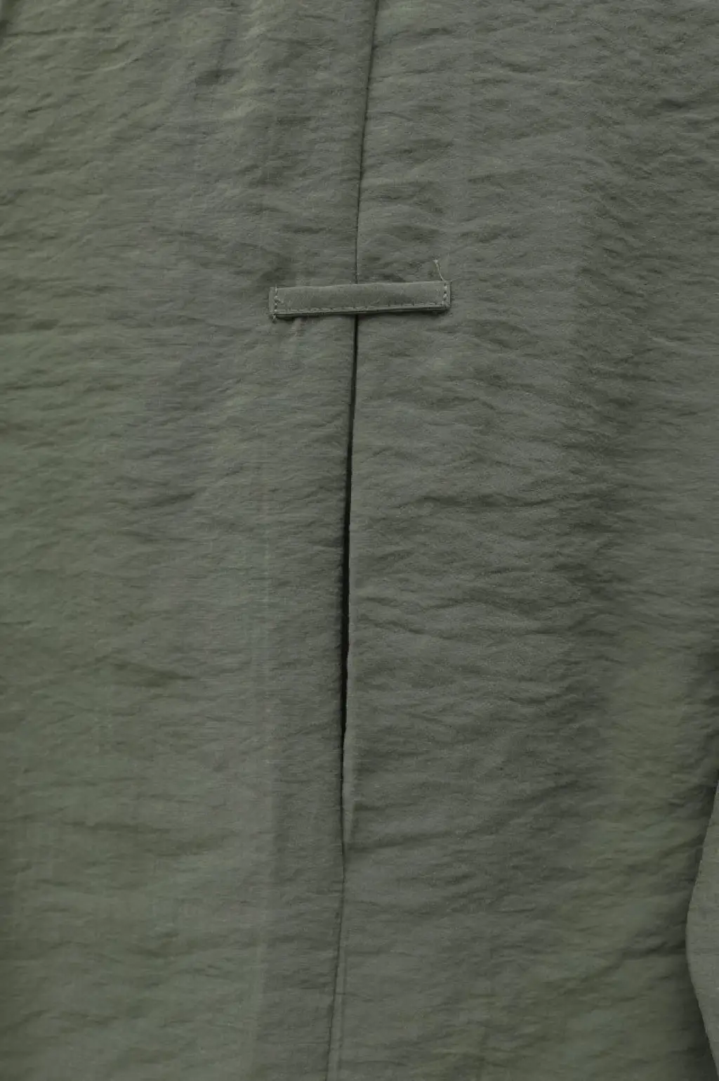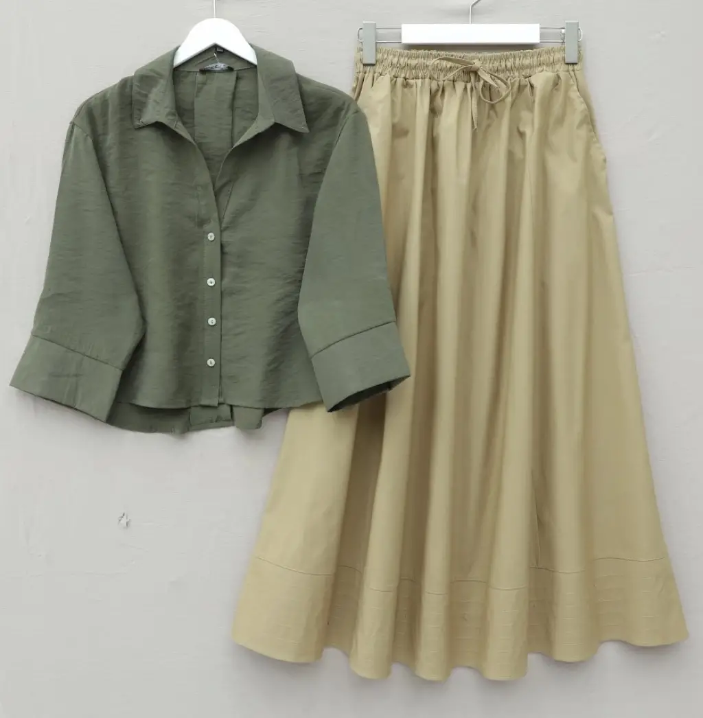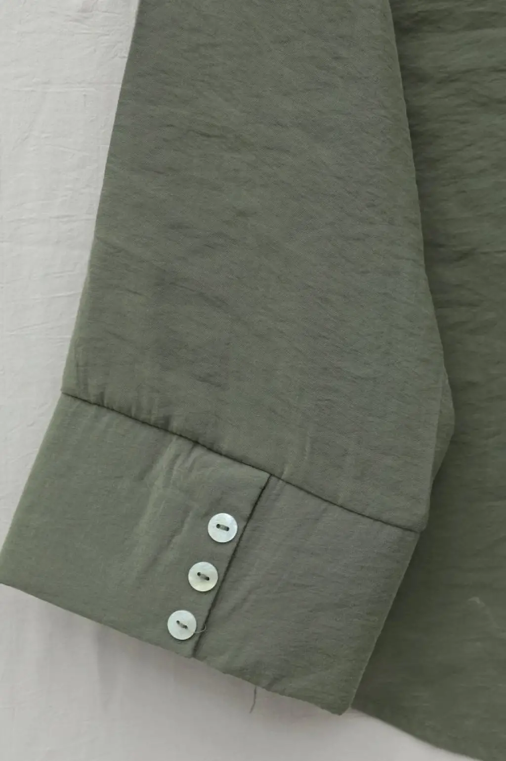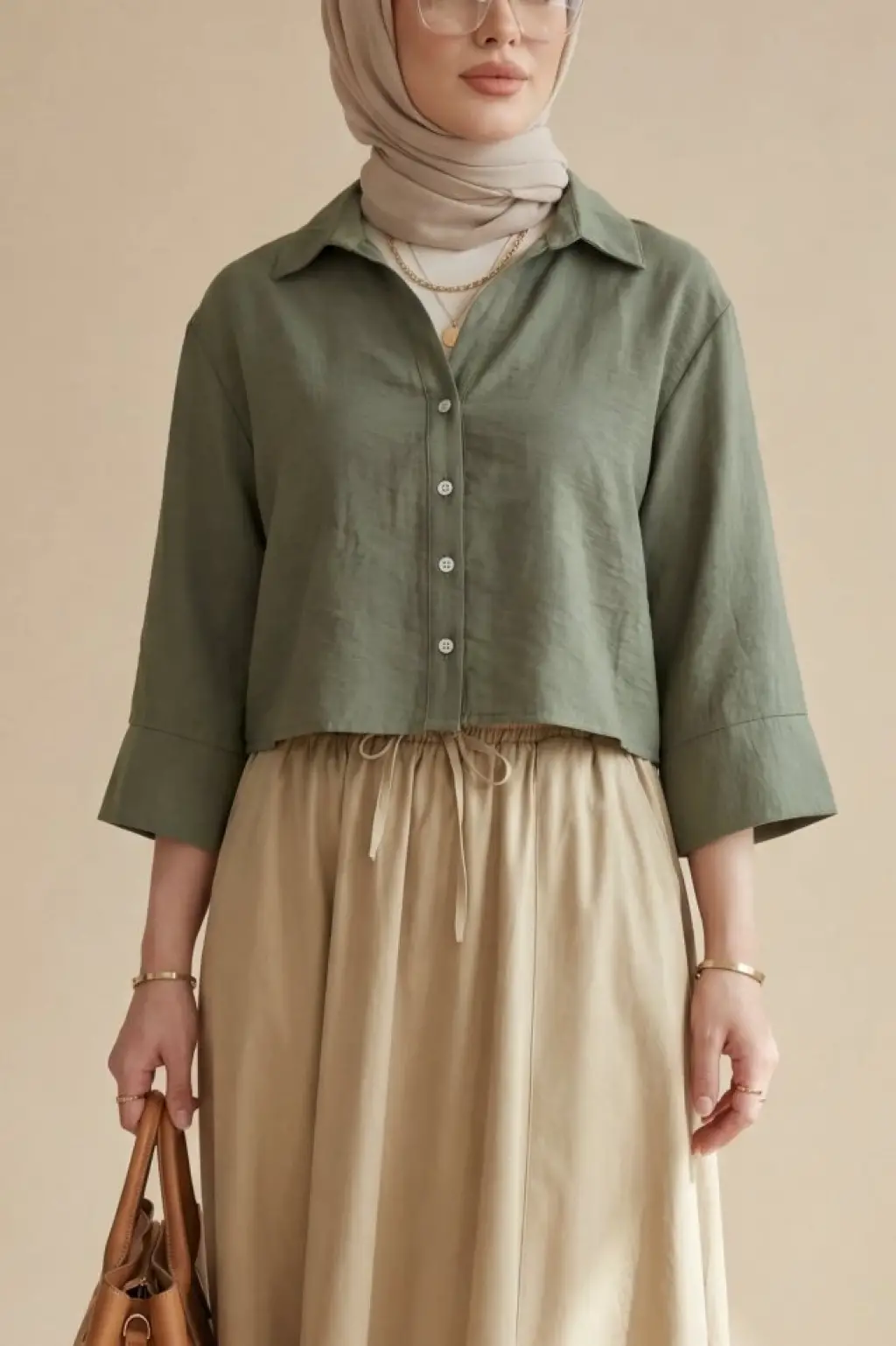V Yaka Düğmeli Yarım Kol Modal Gömlek -Haki
