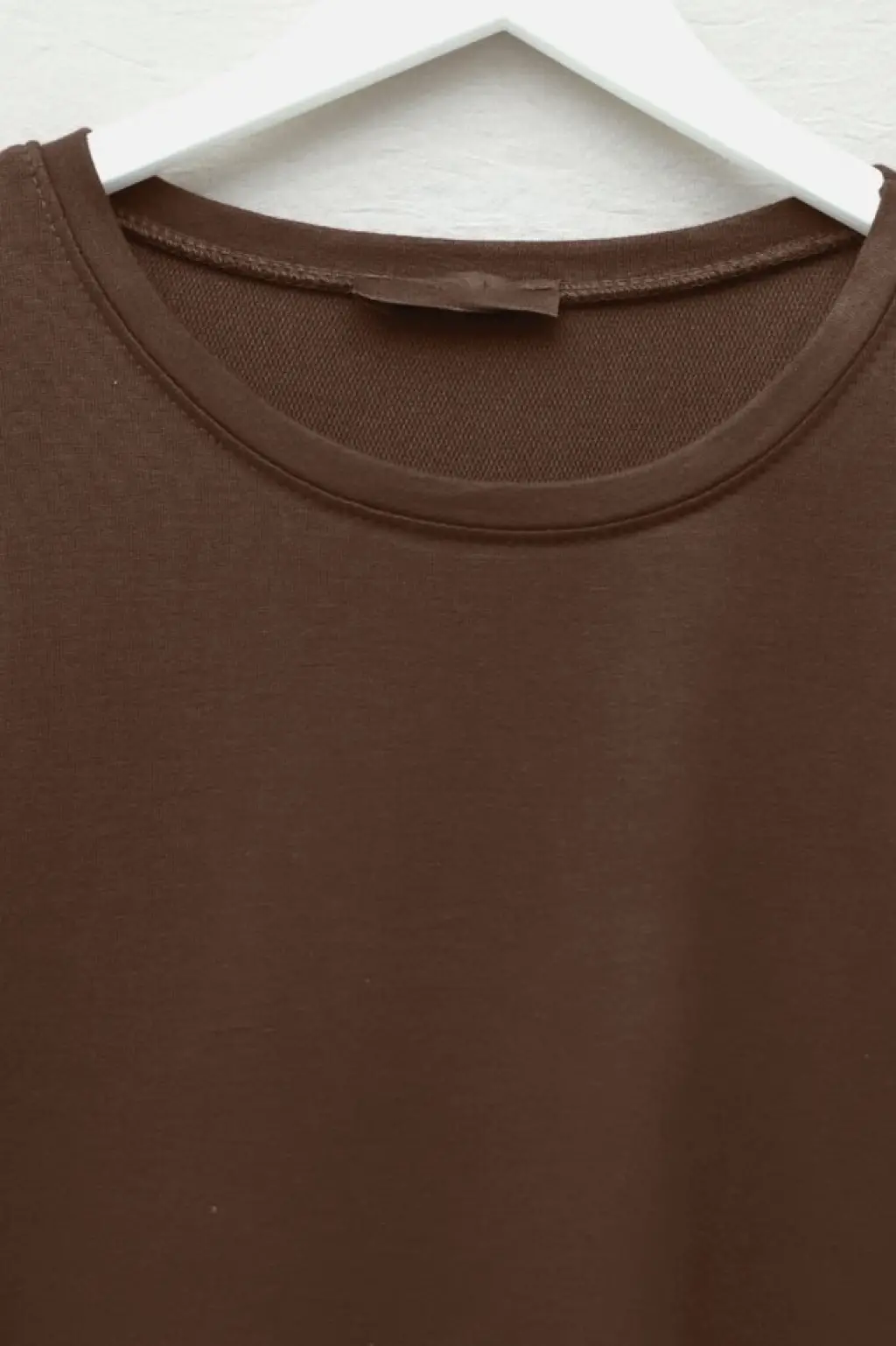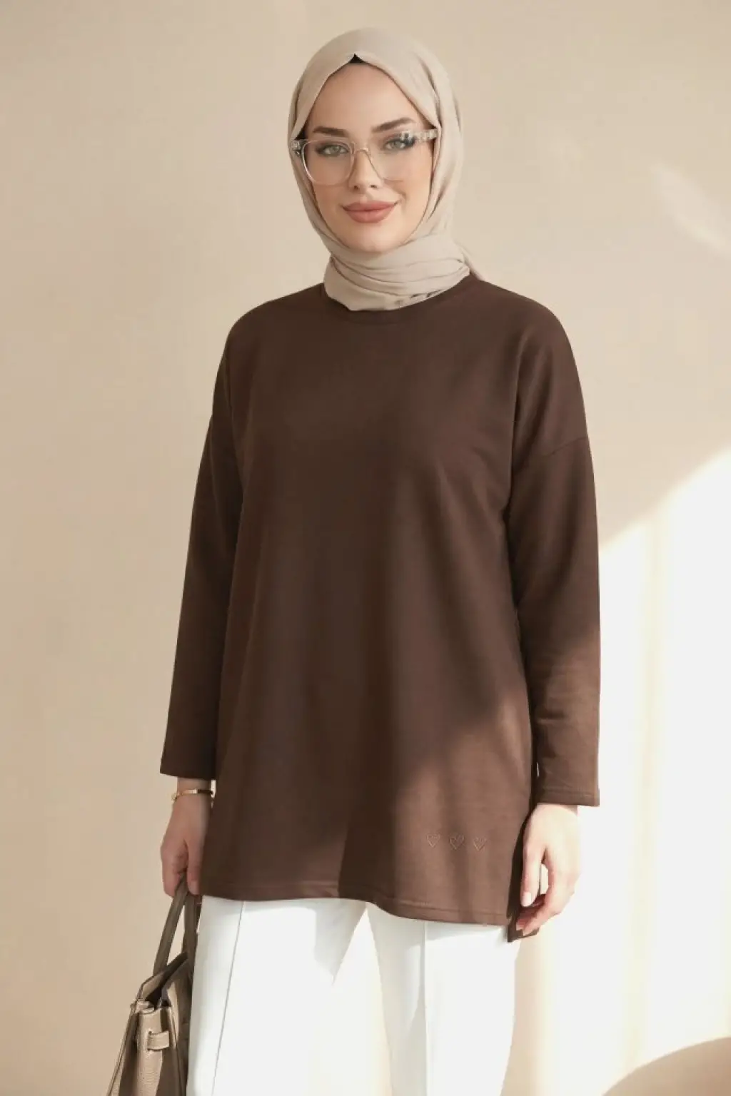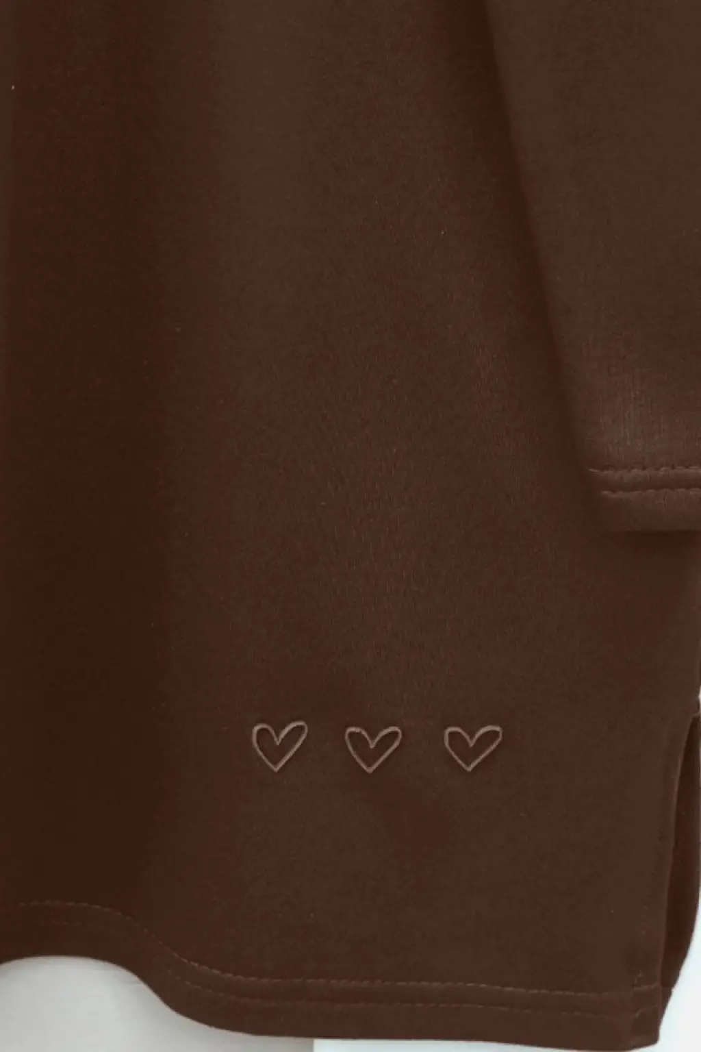 Eteği Kalp Detaylı Yırtmaçlı Salaş Penye Tunik -Kahve
